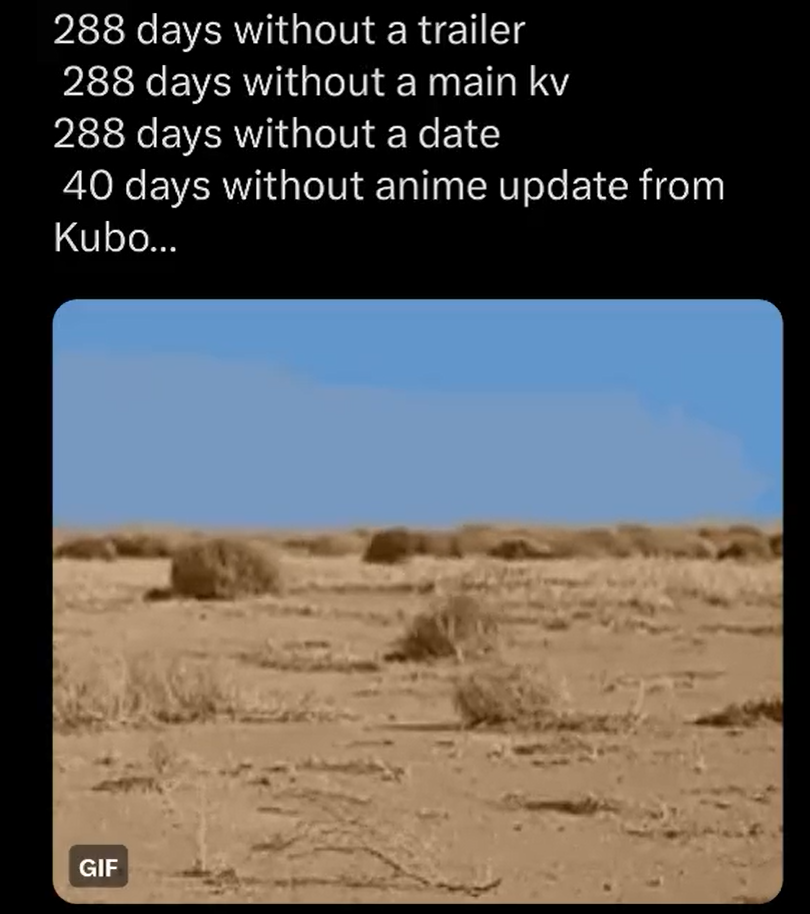 Тайто Кубо: >Я уверен, что многие из наших фанатов задавались вопросом: «Будет ли финал транслироваться в этом году?», но мне жаль говорить, что он был отложен до следующего года. Пожалуйста, подождите еще немного до следующего года. Я верю, что мы сможем завершить его как великолепную работу.
