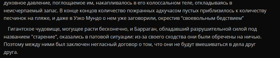 А то исходя из этого текста вырисовывается что сила Старения была у Баррагана ещё 1000+ лет назад, хотя в манге вроде как подразумевалось что это Айзен "дал" ему эту силу (т.е типа старение появилось у него лишь недавно), хотя мб я не так понял просто