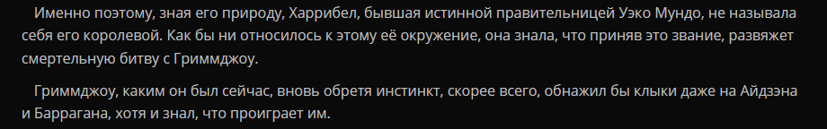 Да и в актуальное время, даже когда этот монстр ослаблен, он, чувствуя слабое реяцу нынешних пустых потешается над Гримджо в ресурексионе который хочет стать королём, говоря что ему до Баррагана как до луны (хотя это Гримджо который типа после времён манги, т.е как минимум немного сильнее чем в арке войны с квинси), а Халибел и Неллиел ваще сравнил с служанками при его дворе, с чего я ваще в голос проиграл
