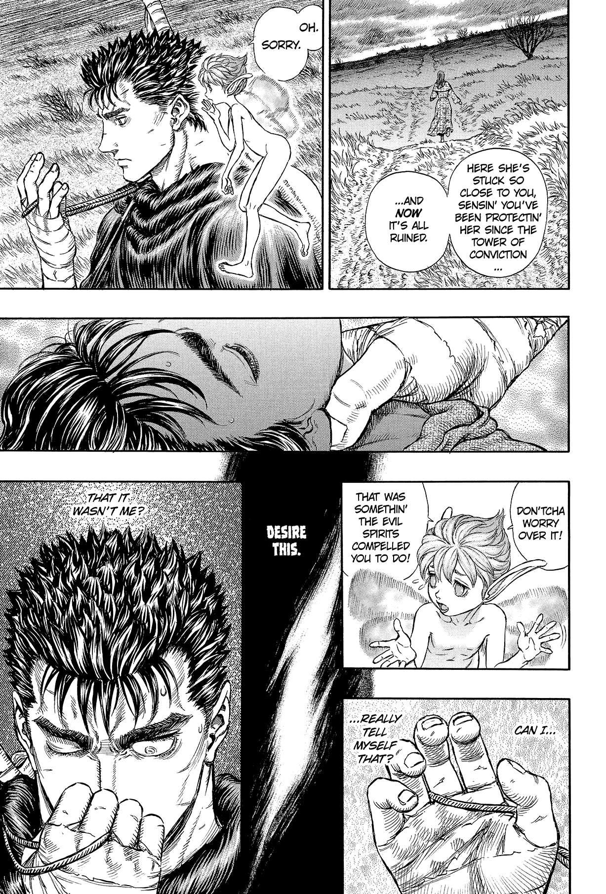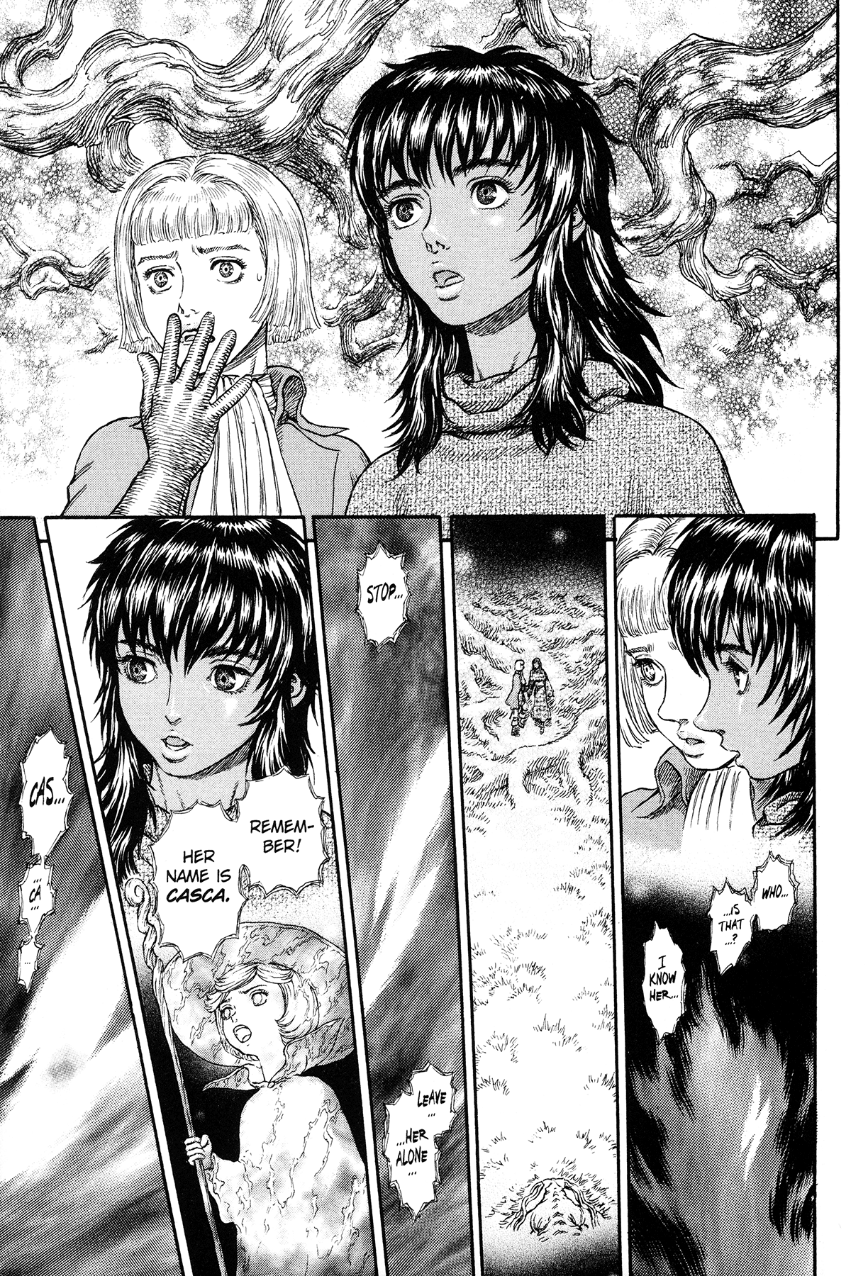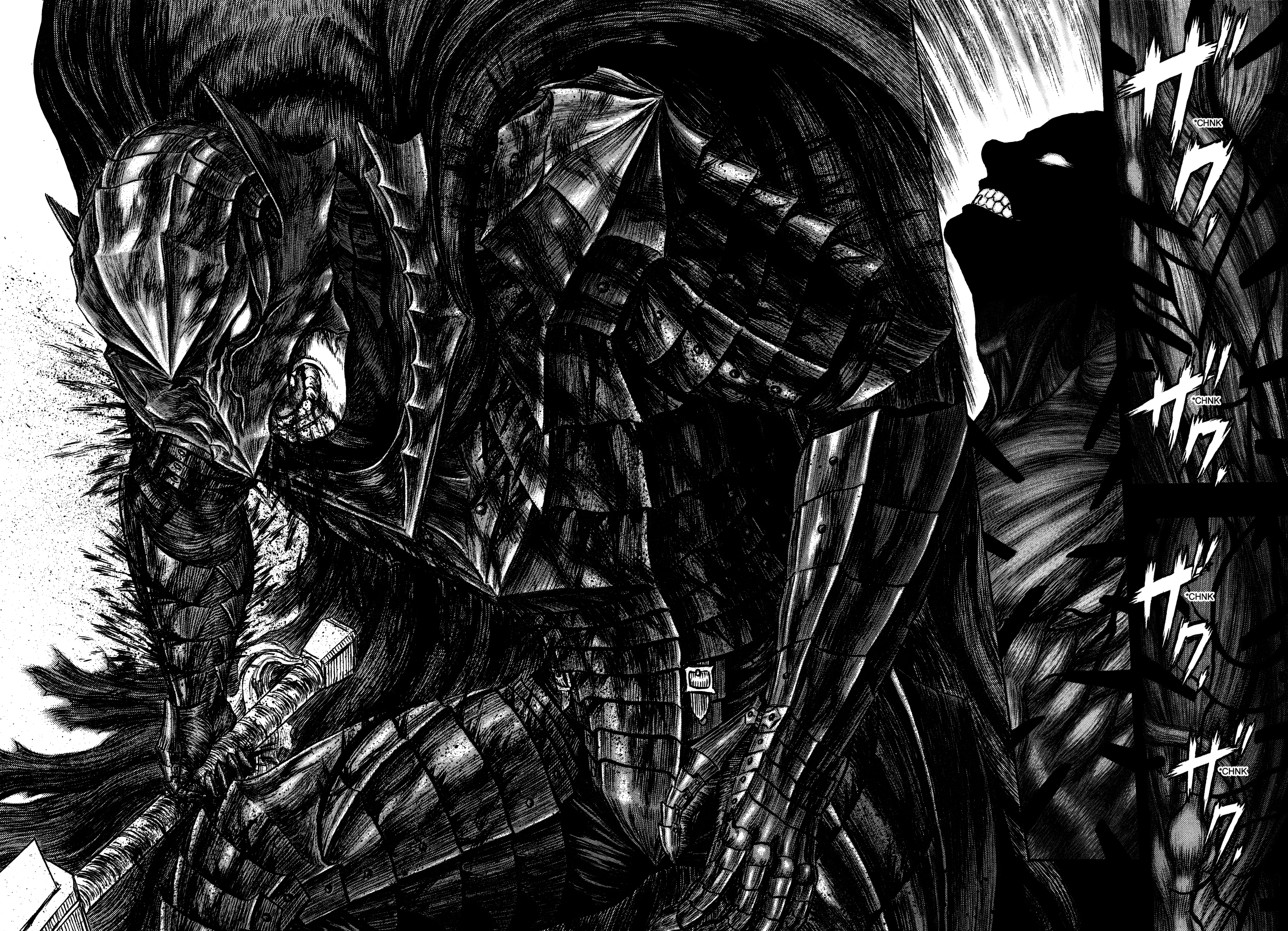 Тем временем, Гатс всю мангу думает и переживает о Каске, мысли о Каске помогают ему восстановить свое эго когда оно посыпалось под воздействием доспеха, несколько раз задается вопросом что же он будет делать когда Каска вылечится и когда его путешествие закончится. Почему Гатс фулл игнорит Каску, а думает о мече о котором никогда не думал - необъяснимый бред Мори, срущего на гроб Миуры. Гатс наоборот должен воспылать новой злобой и силой от того факта что его сознательное желание теперь совпадает с его бессознательным желанием - и сам Гатс и его Зверь теперь в гармонии, так как оба желания ведут к Гриффиту.