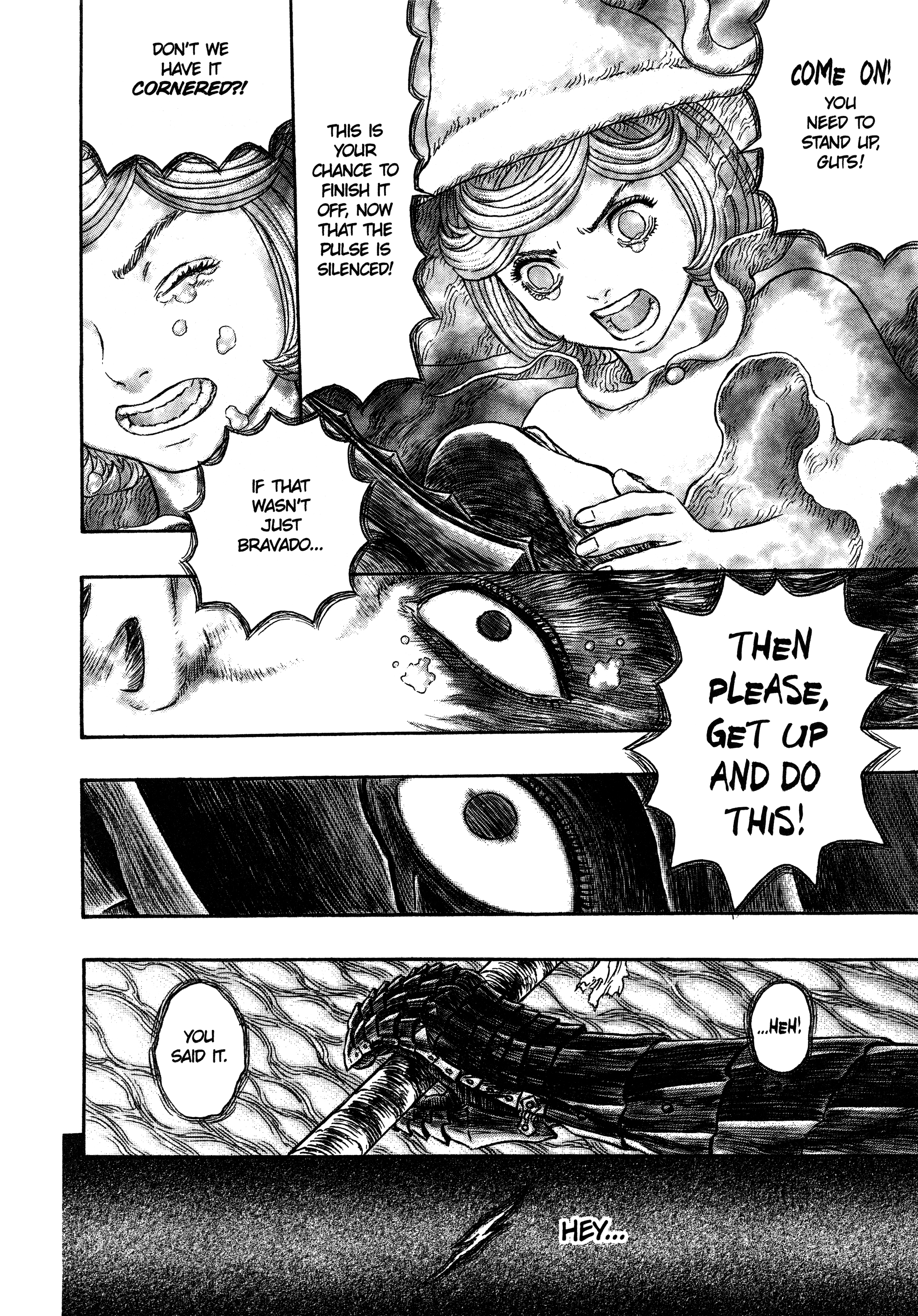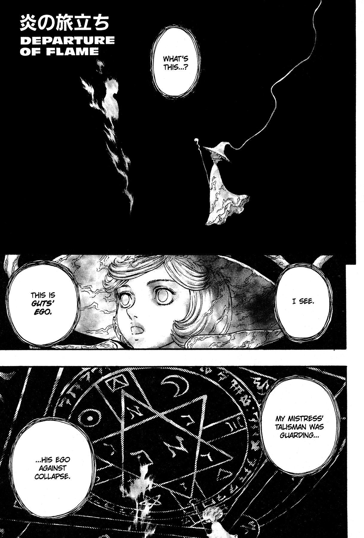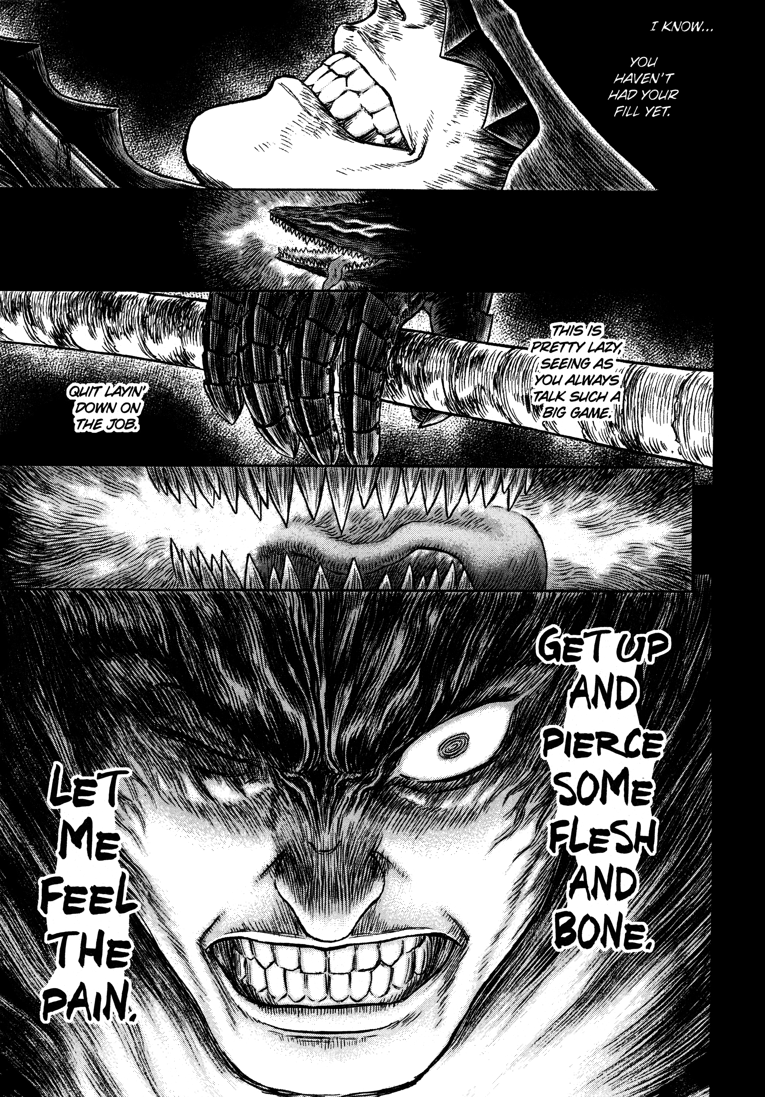 Тем временем, Гатс всю мангу думает и переживает о Каске, мысли о Каске помогают ему восстановить свое эго когда оно посыпалось под воздействием доспеха, несколько раз задается вопросом что же он будет делать когда Каска вылечится и когда его путешествие закончится. Почему Гатс фулл игнорит Каску, а думает о мече о котором никогда не думал - необъяснимый бред Мори, срущего на гроб Миуры. Гатс наоборот должен воспылать новой злобой и силой от того факта что его сознательное желание теперь совпадает с его бессознательным желанием - и сам Гатс и его Зверь теперь в гармонии, так как оба желания ведут к Гриффиту.