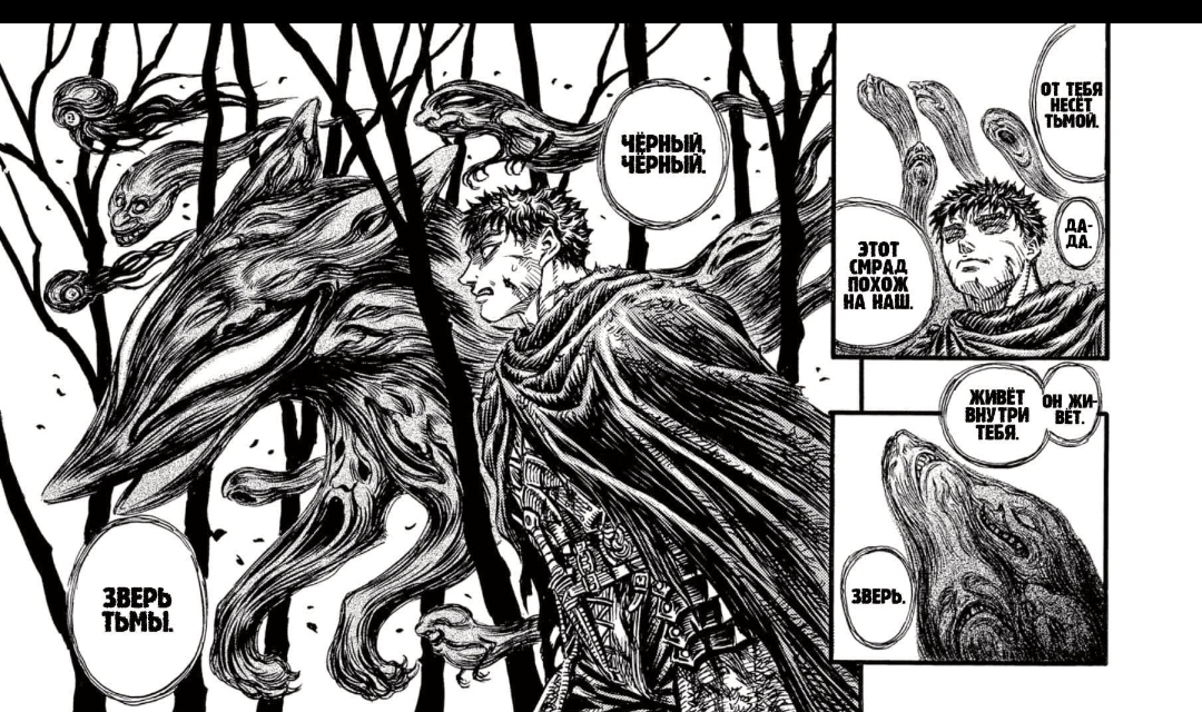 Повторю еще раз - в этой сцене Гатс выбрал свою человеческую сторону (решил что вернет Каску и будет с ней) и отринул темную сторону (желание убивать апостолов как он это делал два года нон-стопом). Поэтому Гатс показан отдельно от Зверя Тьмы, именно тут Гатс вступил в конфликт с самим собой. Просто блядь прочитай главы возвращения Гатса к Годо и посмотри какой там контекст. Гатс видит как Рикерт проскорбил через символические похороны и впечатлился его силой духа. Потом послушал речь Годо про трещины в мече и незаменимые вещи в жизни. Потом Гатс сидит в пещере и рефлексирует о том чем он занимается, он понимает что горит "черным пламенем" которое сжигает как его врагов, так и его самого, а Каска это огонек бонфаера из времен Золотого Века который все еще теплится у него в груди и не позволяет Гатсу быть полностью поглощенным тем "черным пламенем". И тогда он меняет приоритет на то что он вернет Каску и больше никогда не бросит. "Черное пламя" = Зверь Тьмы = темное деструктивное желание. Каска = огонек мечты из Золотого Века = желание сохранять человечность. Когда Гатс сменил приоритеты, его темное желание не исчезло, оно было лишь отвергнуто и подавлено. Но оно все еще существует и гложет Гатса, поэтому он исполняет хуйню с Каской и в итоге сам понимает что он представляет для нее опасность. Причем тут злые духи, если все это повествование про душевные терзания персонажа и его протекающий чердак?