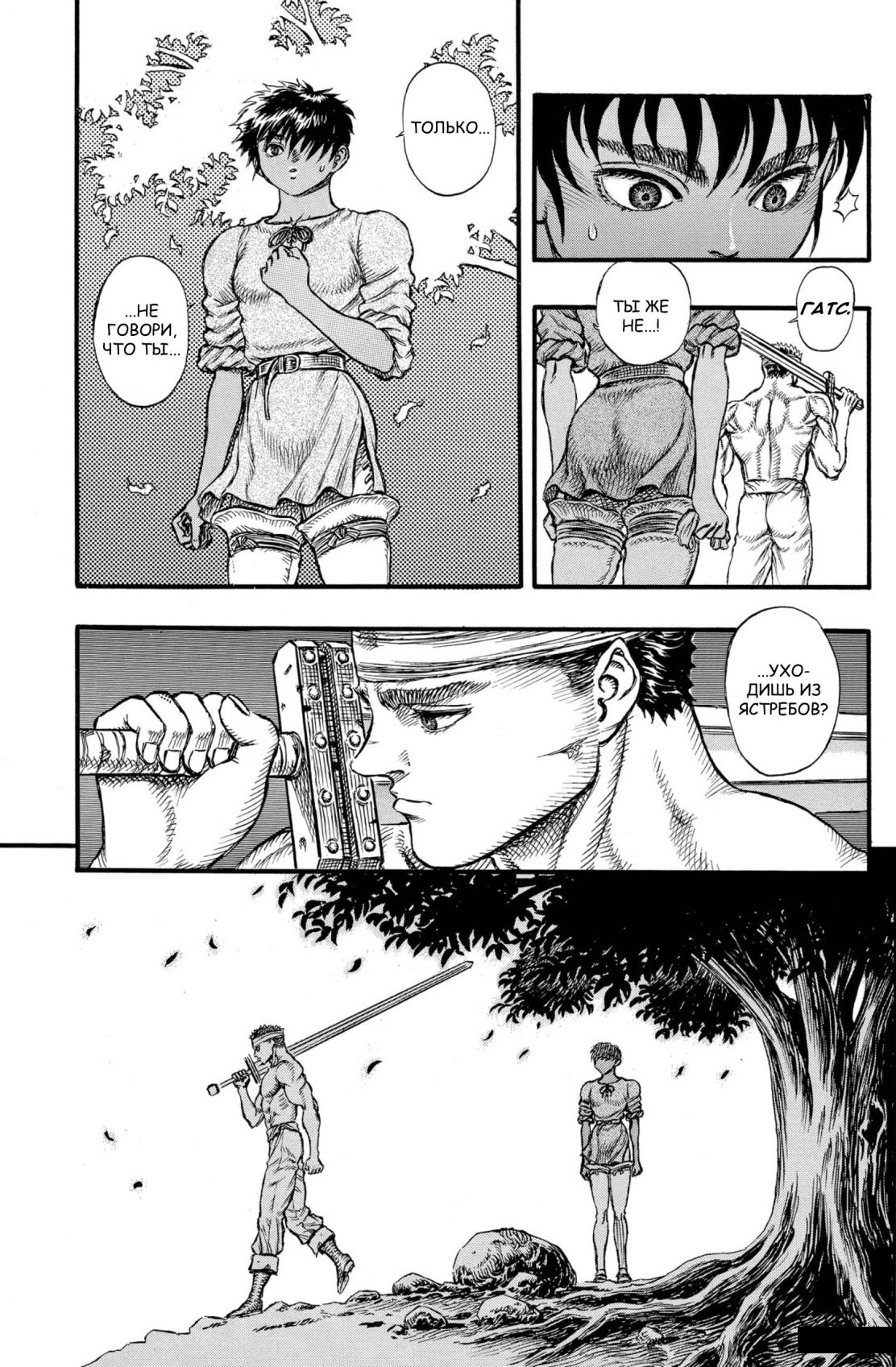 Здесь же Гриффиту было вообще насрать. Гатс махал мечом, брызгал слюной, визжал как порось, а тот не реагировал. Он просто появился из ниоткуда, просто забрал Каску (снова) и просто также испарился. Никакого сопротивления не было. Гыня абсолютно беспомощен. Впервые за много лет Гыня ощутил что-то вроде покоя, приключение подошло к концу, Каска снова здесь, его не ебут ночами бабайки, но снова появляется патлач и всё это отменяет за одну ночь. Считай не было никакой манги до этого вообще, мы снова там же, где всё начиналось.