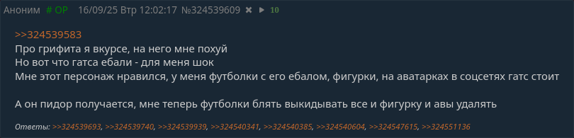 >Персонажи не стали резко Как раз резко стали. Это не просто так совпало что Гатс превратился из Гатса в Синдзи ровно тогда когда другие писатели подключились. Не просто так правила и факты установленные Миурой вдруг поменялись или игнорятся с новыми создателями. Не просто так буквально все персонажи ведут себя как не свои в продолжении. Иди проспись, ебанутый, а потом сам мангу перечитай, может сам заметишь что тебя подъебывают.