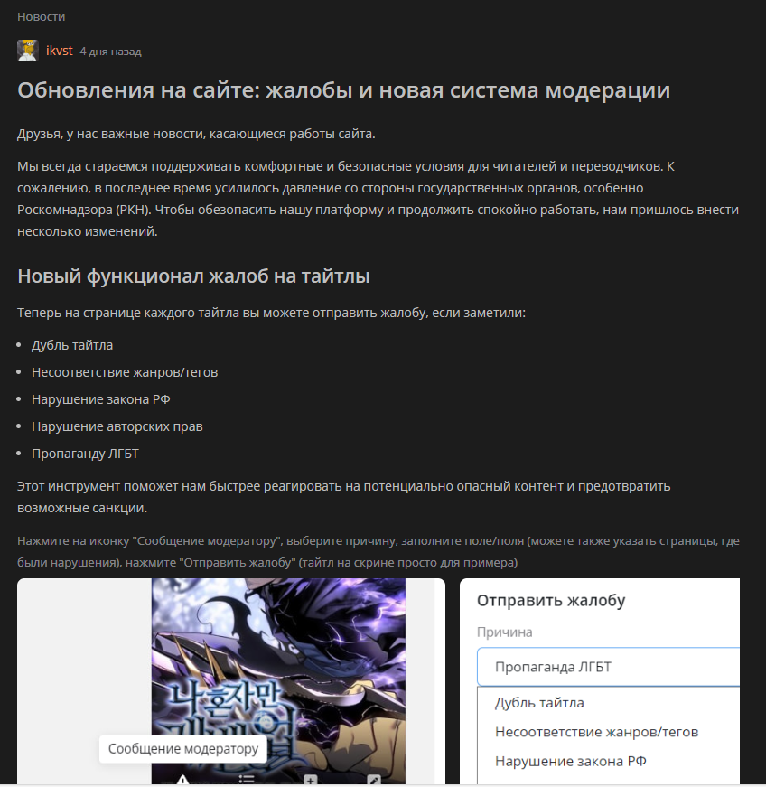 1️⃣ Новый инструмент для жалоб – теперь на каждой странице тайтла можно отправить жалобу, если вы заметили: