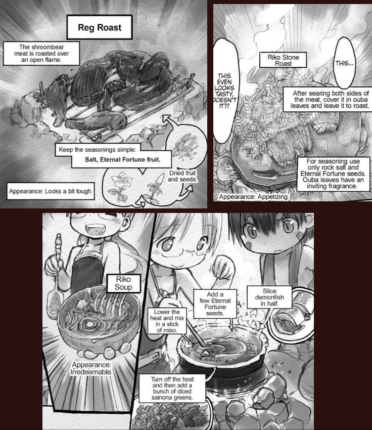 Второе - пародия там не на тему опускания в данжон, а на тему готовки, рико с первых глав готовит блюда из местной фауны с характерными шуточными меню, в данжоне это стало фактически центральной темой. Есть там и прямые отсылки типа пикрелейтед (лес на втором уровне с гротами по бокам, где Озен с командой артефакты копают), так же в одном из спинофов фарлин упоминает некого пса по кличке рег.