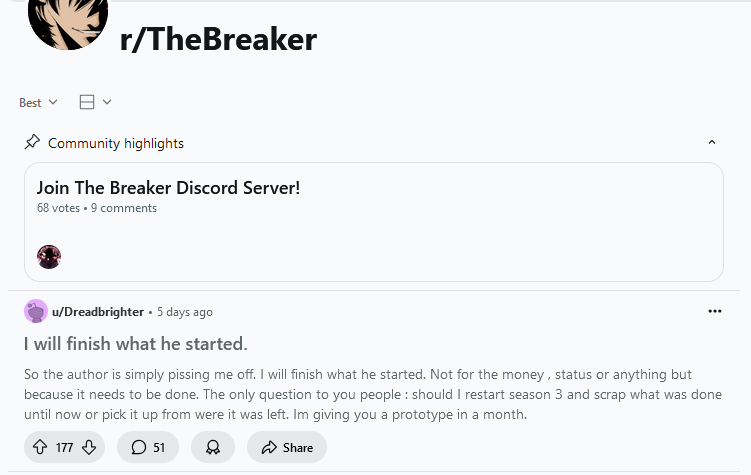 >>2445923 Ты скриншот-то прочитал? Там какой-то клоун-террорист пишет, что будет рисовать свою версию третьего сезона вместо оригинальных авторов. А так брейкер просрал все полимеры когда начал этот самый третий сезон рисовать в цвете да и в формате вебтуна. И хуй был положен уже тогда, в самом начале.