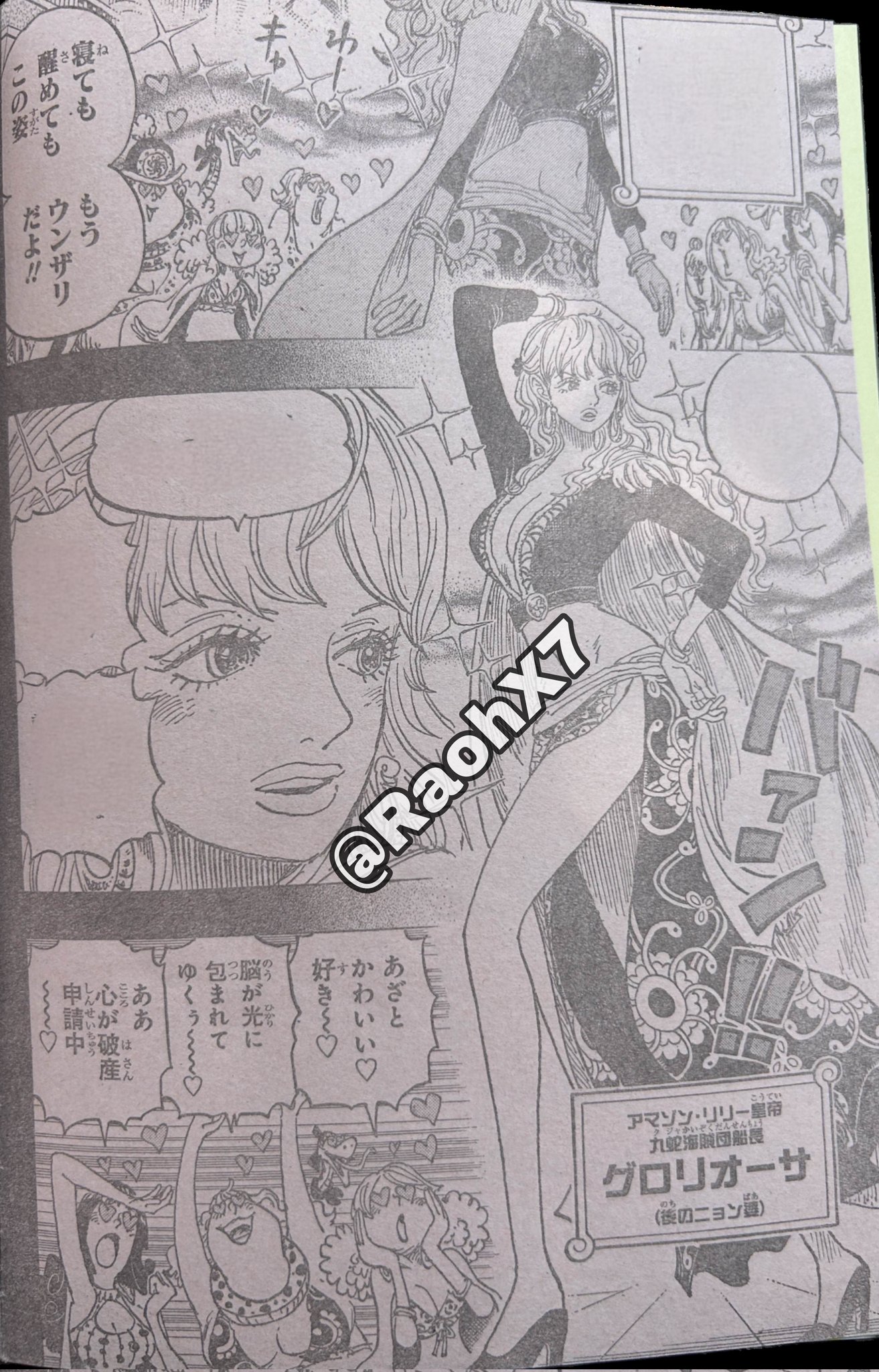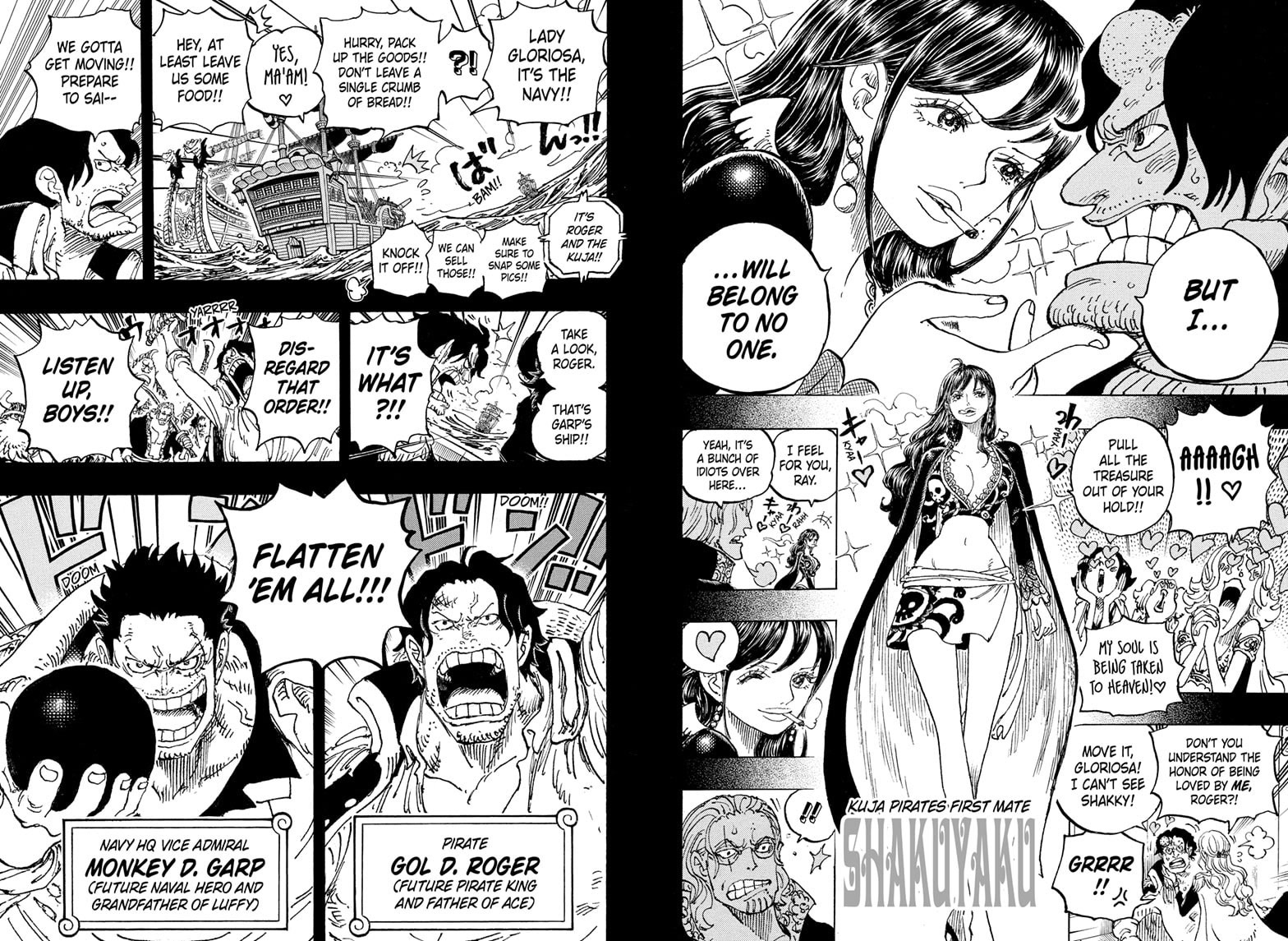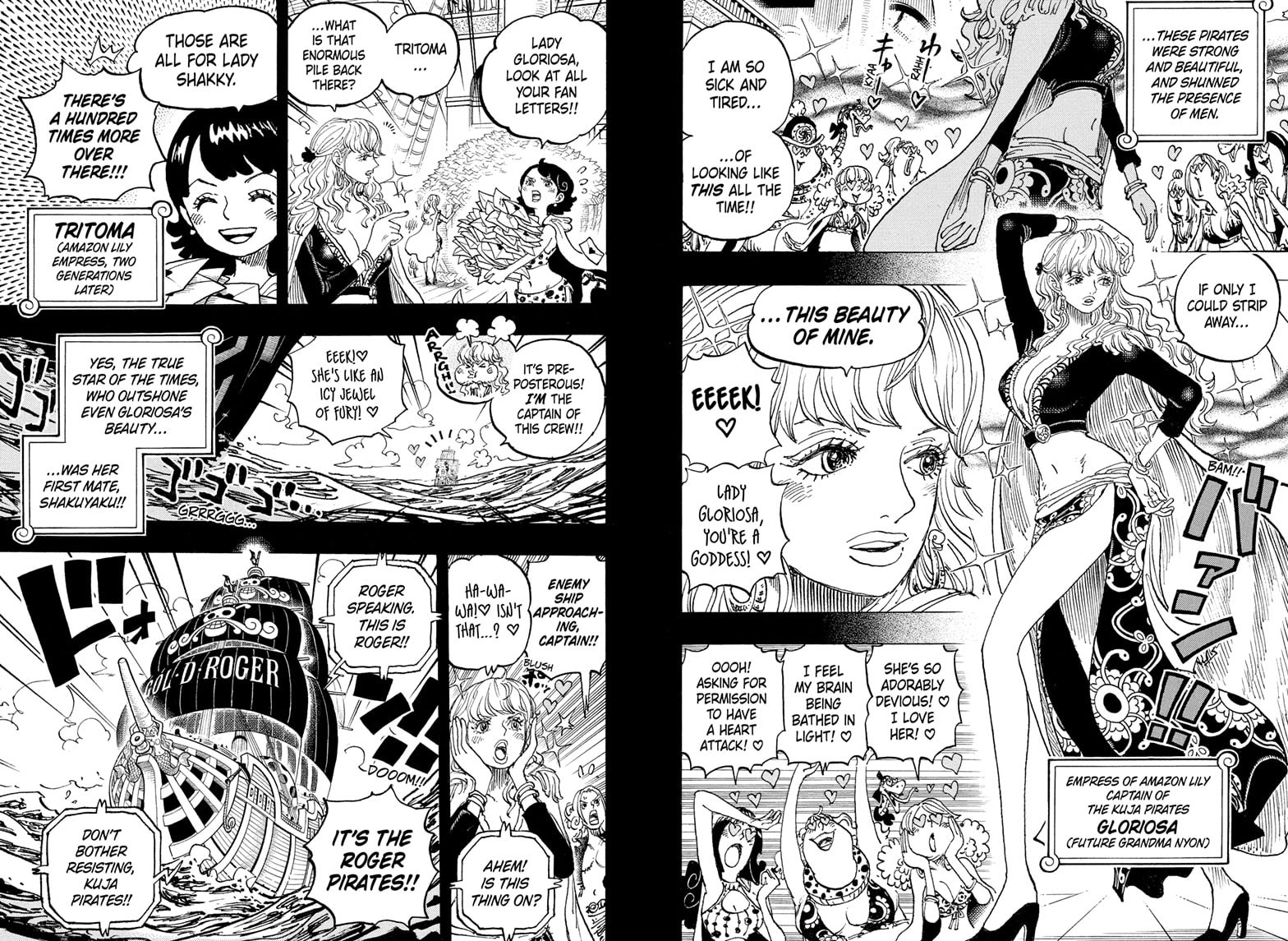 На Шаки пускали слюни весь мир, мы поняли, спасибо. Еще бы горосеев показал, который смотрят на ее листовку с сердечками-глазами. Очень странно, что был скрыт так долго факт, что Гарольд мог присутствовать во время инцидента в Долине Богов. Неужели Ода покажет, что Гарп и Роджер это фрауды? Которым понадобилась помощь Гарольда для победы над Роксом. Там небось еще и Гарлинг участвовал, но тоже скрыли, чтобы слава досталась Роджеру и Гарпу.