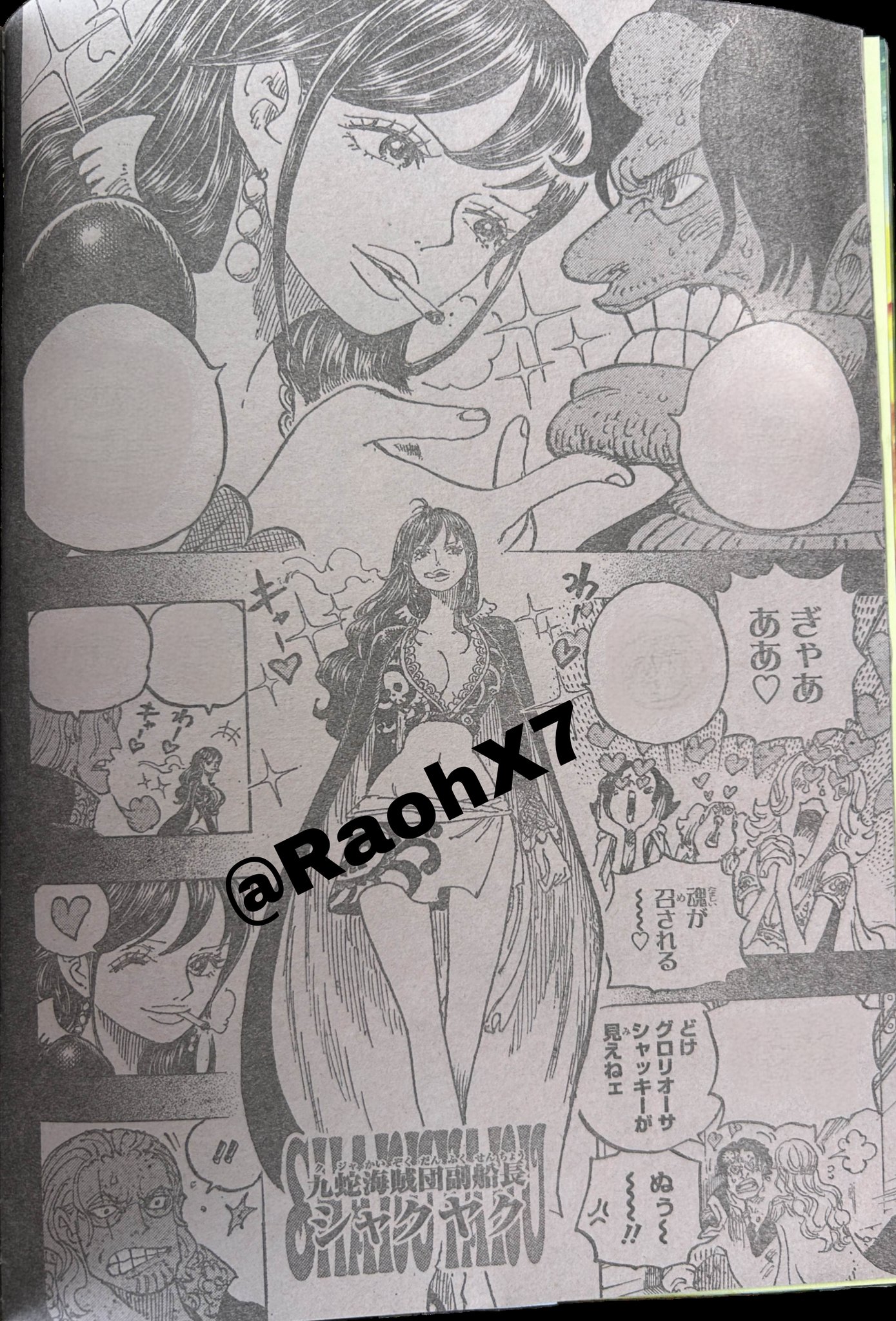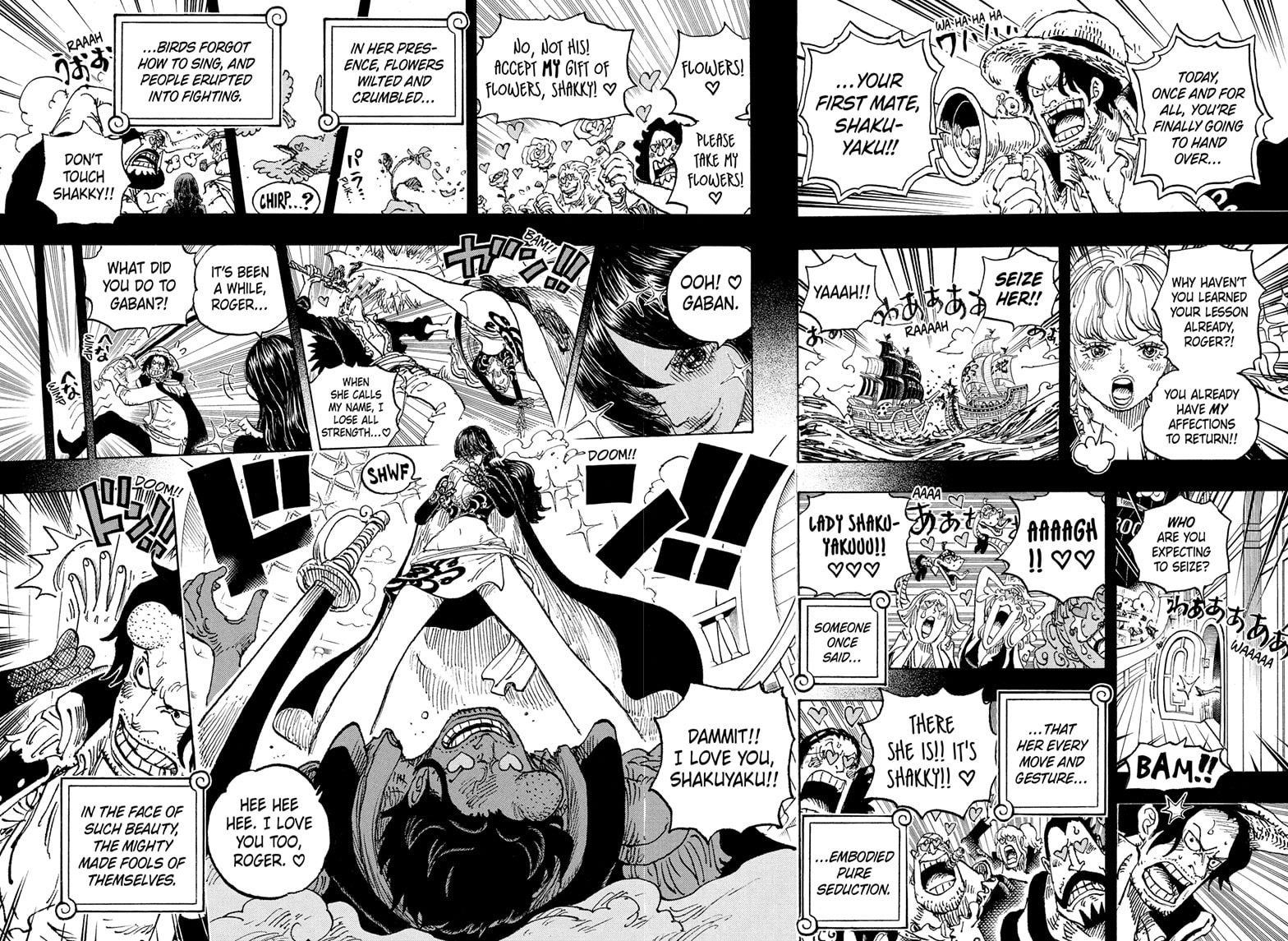 Шакки прибыла на Хачиносу, покинула пиратов Куджа и пришла, чтобы открыть бар на пиратском острове. Пираты Рокс влюбились в неё (включая Рокса и Белоуса). Бар Шакки стал легендарным, и люди называли Шакки «сокровищем Хачиносу». Сцена забавная: все смотрят на Шакки, их сердца буквально «выпрыгивают» из тел, а в глазах сердечки.