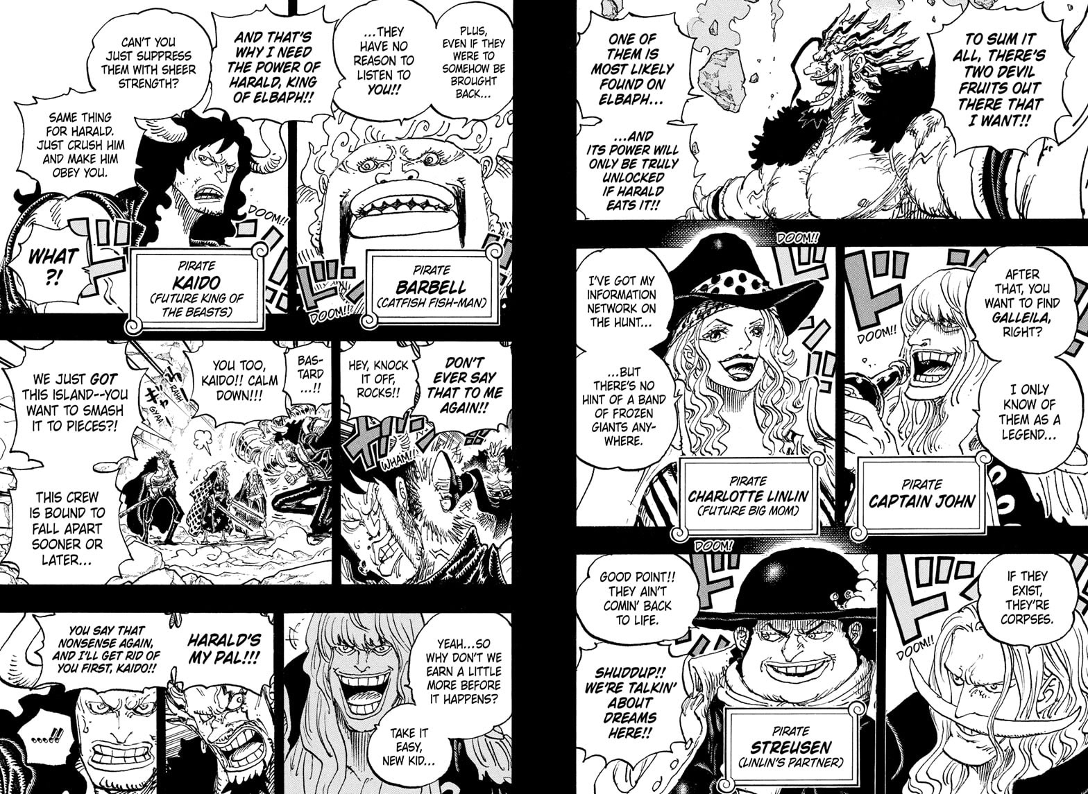 Ну что по спойлерам никакой новой инфы, Роджер бахнулся с Гарпом, Рокс собрал команду и планирует посетить Эльбаф где хранится легендарный фрукт. Всего легендарных фрукта 2, они нужны для победы над Мариджоа.
