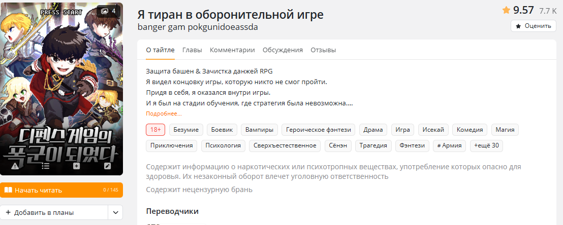 Переведено всего 26 глав на русский, ибо средний идиот-переводчик любит переводить одно говно а тайтлы с хотя бы относительно хорошими сценариями тонут в небытие(сами учите ваш заморский). На инглише можно найти 100+ глав.