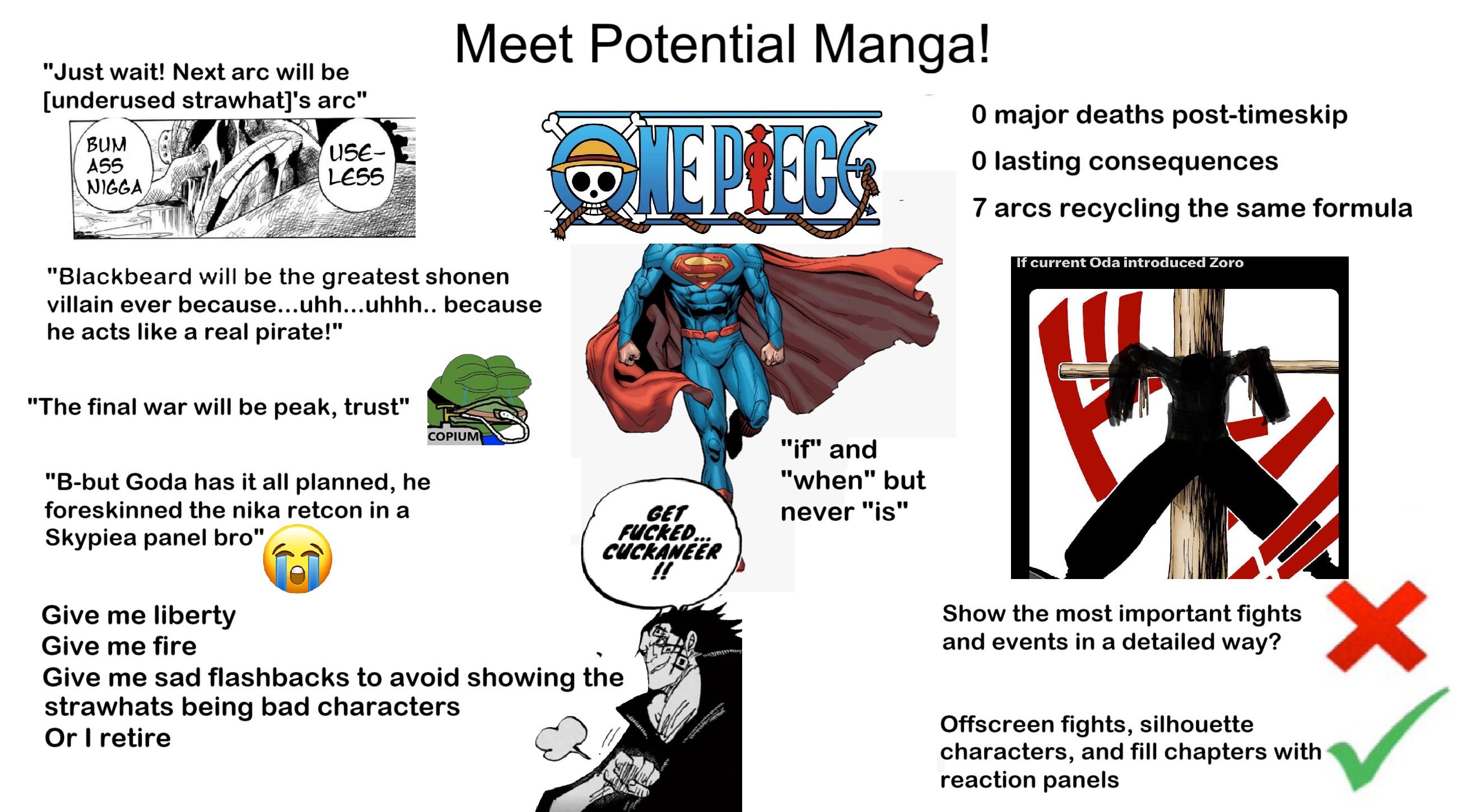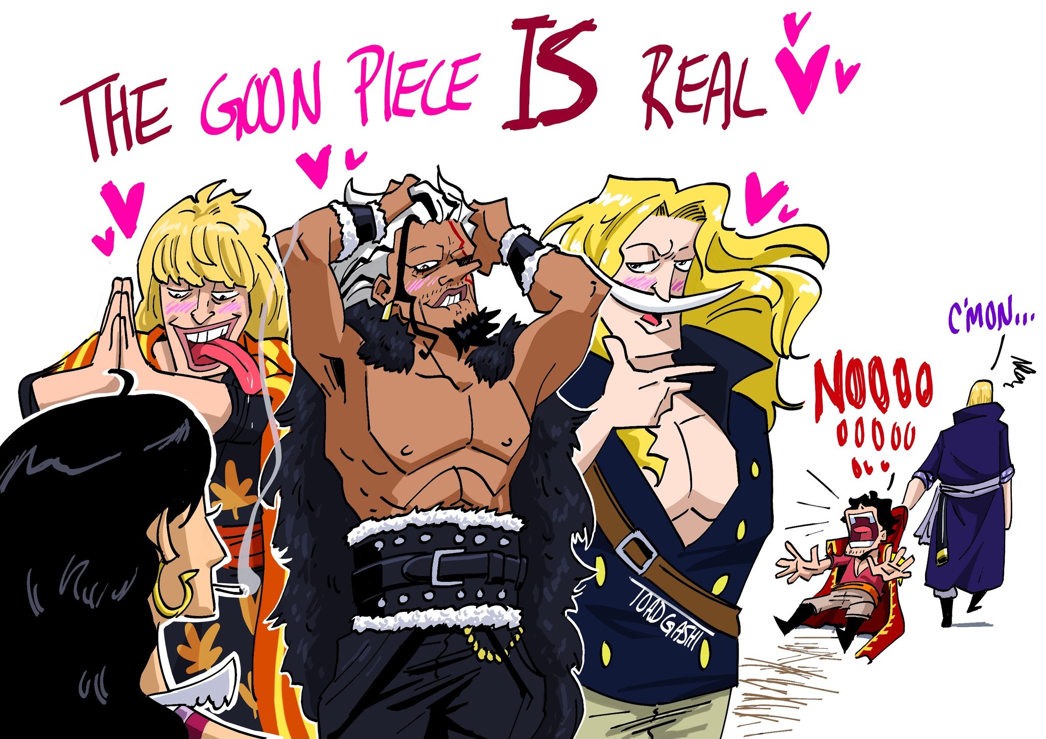 >>за серьезными и плоскими персонажами пиздуйте в Блич, Ван пис про многогранность Так, что тут у нас в Ван Писе. Зоро - серьезный и заблудился Санджи - закурил и кровь из носа Чоппер - милый Нами - сиськи экстраверт Роби - сиськи интроверт. Уссоп - боится Фрэнки - руки вверх СТАР Брук - просит понюхать трусы Джинбей - ? Луффи - сидит в клетке/змее/тюрьме и выходит бить главного босса в конце арки. Между главными героями 0 диалогов.в Бличе хотя бы рисовка заебись и тянки, в Ван Писе ебаная мазня, потому что рисует 20 ассистентов.