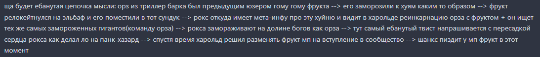 Короче складывается впечатление что Эльбаф медленно но верно идет по пути Вано, Ода сейчас снова замахнулся на абмициозный масштаб, но не вывезет. Начинали за здравие, что Эльбаф лучшая пост-тс арка, но я теряю веру с этим блядским флешбеком.