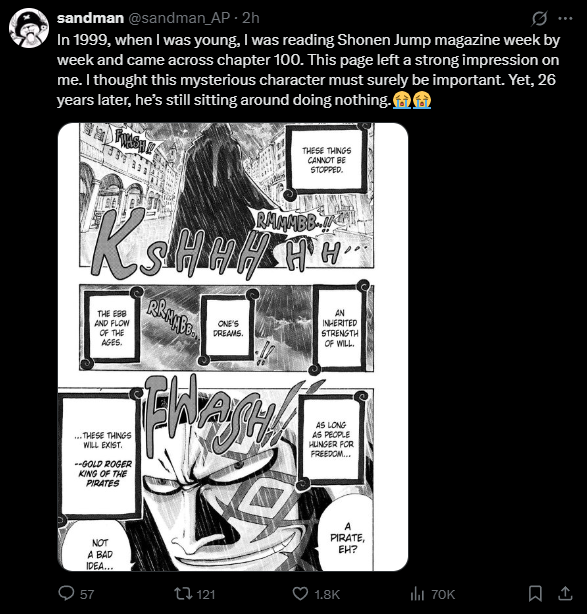 >sandman: В 1999 году, когда я был молод, я каждую неделю читал журнал Shonen Jump и наткнулся на сотую главу. Эта страница произвела на меня сильное впечатление. Я думал, что этот загадочный персонаж наверняка должен быть важным. И вот прошло 26 лет, а он всё ещё сидит без дела.