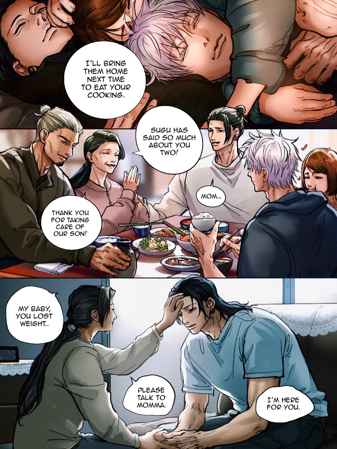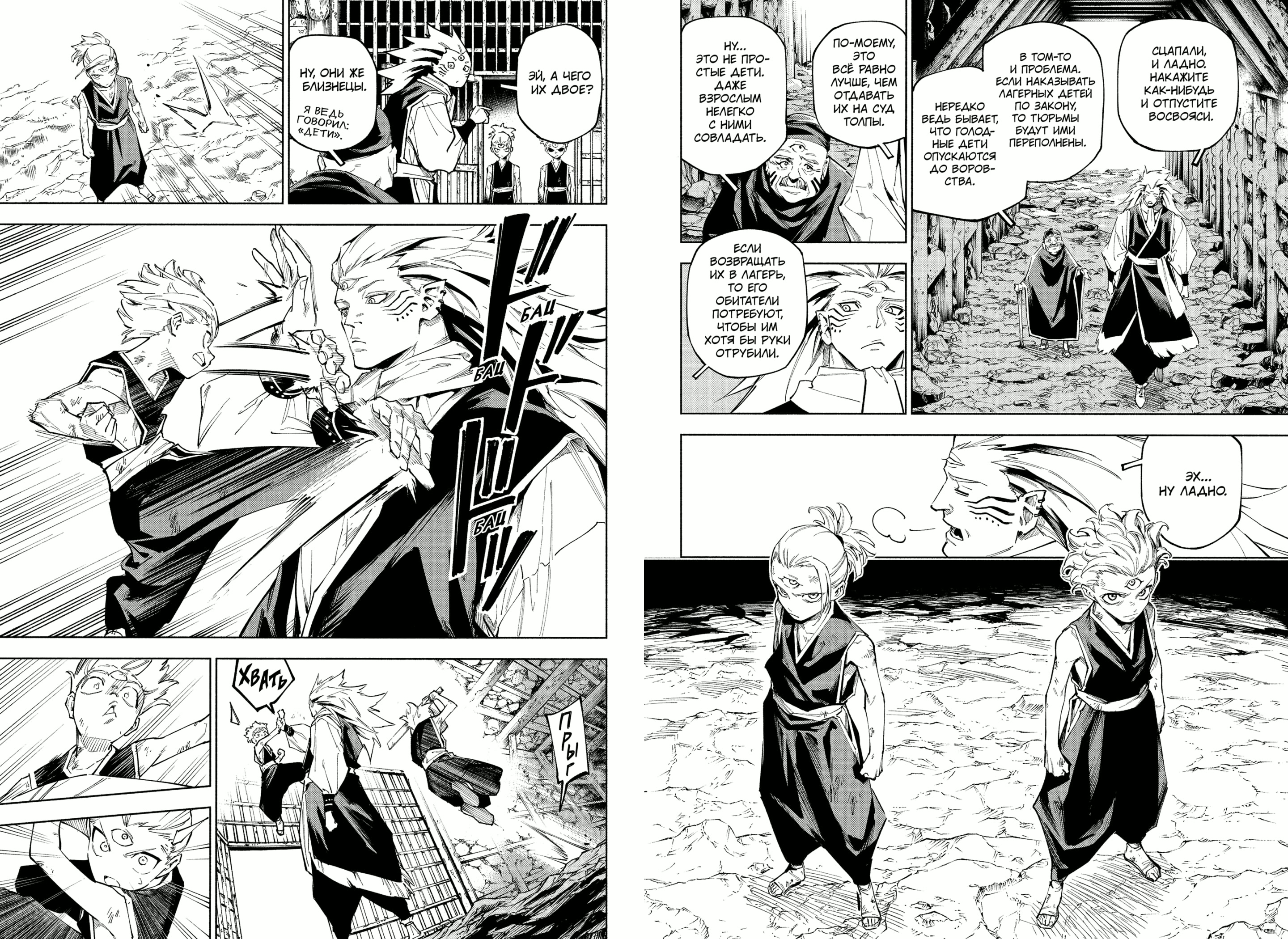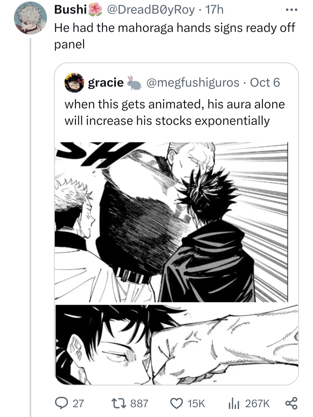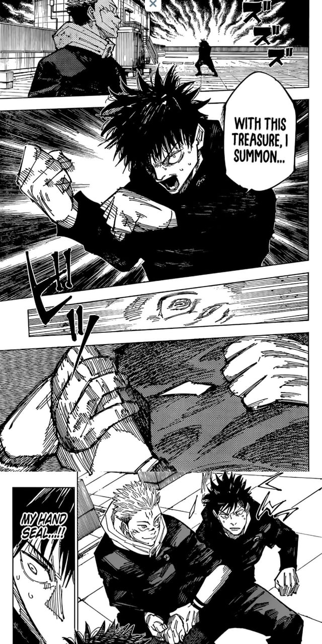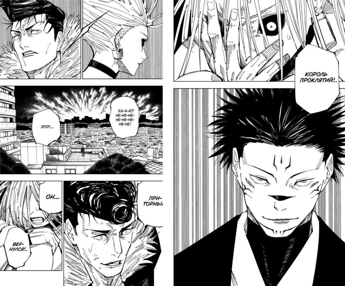 Кстати да. Вчера увидел, не вспомнил момент из манги. Бонес вдохновились Гегой и спиздили сцену в геройку напоследок. Двойная синема. Не нравится этот разворот из за уродливого нарисованного Махито. Маппа должны были не просто покрасить страницу, а анимировать ее в стиле аниме блять.