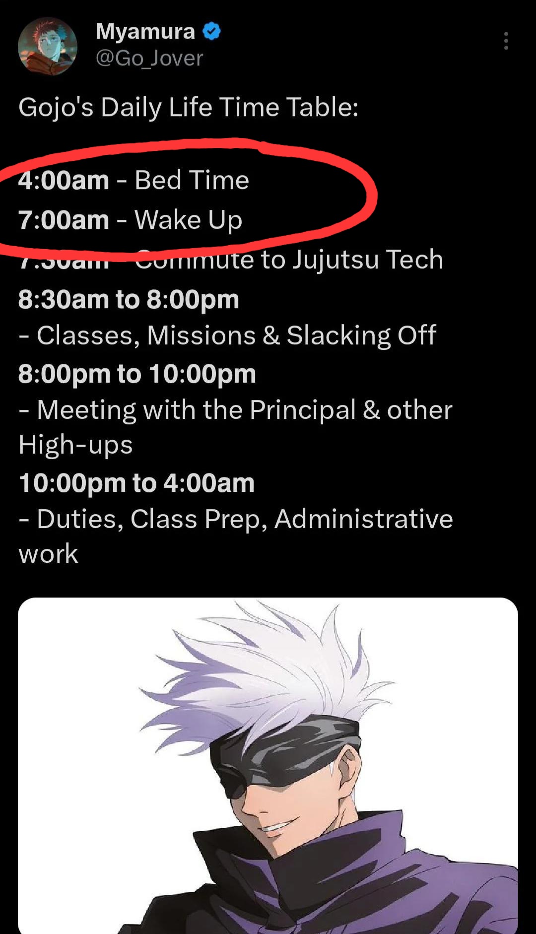 >>2455466 Именно так. Поэтому Годжо и проиграл. Если бы он выспался, расклад был бы совсем другим. Нобара дремала два месяца и поднялась от жертвы Харуты до убийцы Сукуны. Сам Сукуна хранит секрет своего могущества - хеянскую технику здорового сна по 15 часов в день, от современных магов