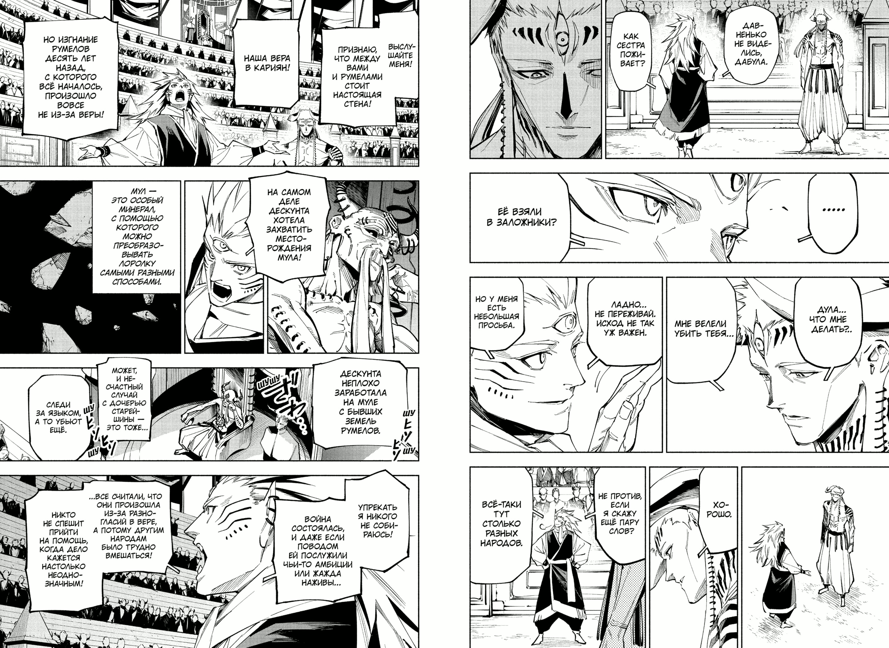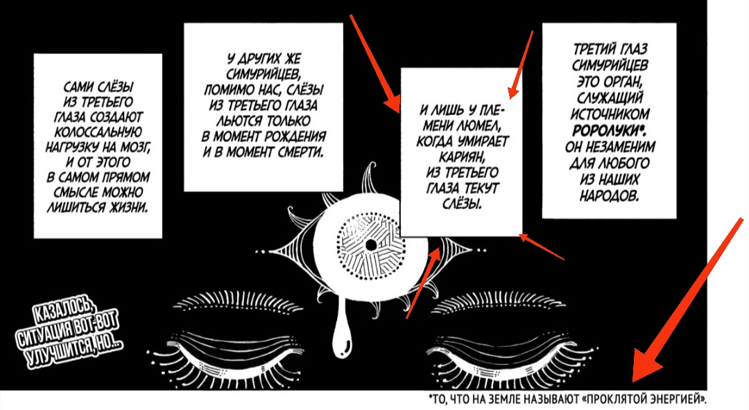 И если вам в предыдущей главе казалось, что Геге байтит НасрутоБоруто кальчик, своими подозрительными срёмарианами, очень напоминающими Ооцуки. То вам не показалось. В новой главе Геге буквально ворует лор Учих и механику Шарингана, адаптируя его под своё сатиристичное произведение.