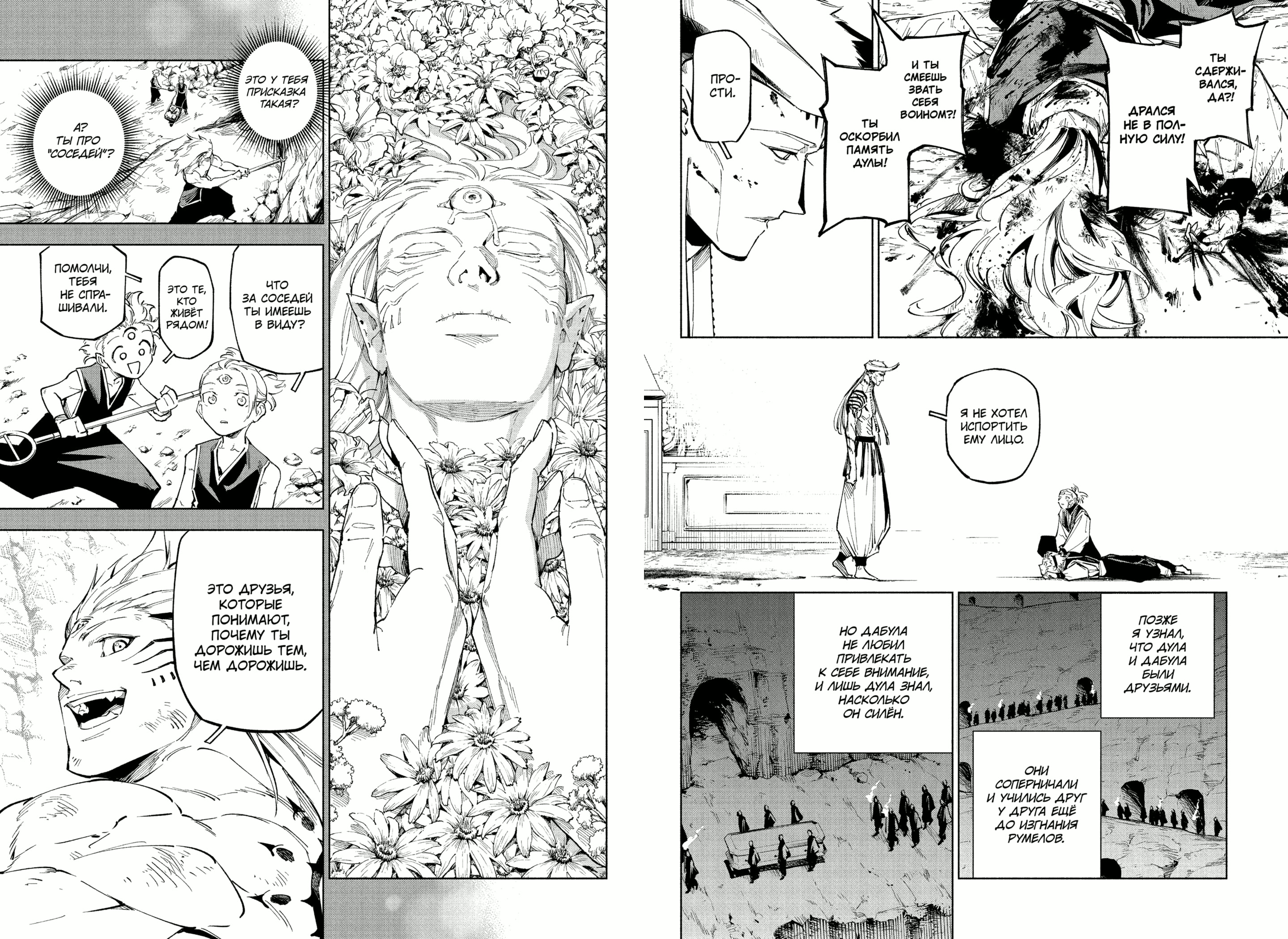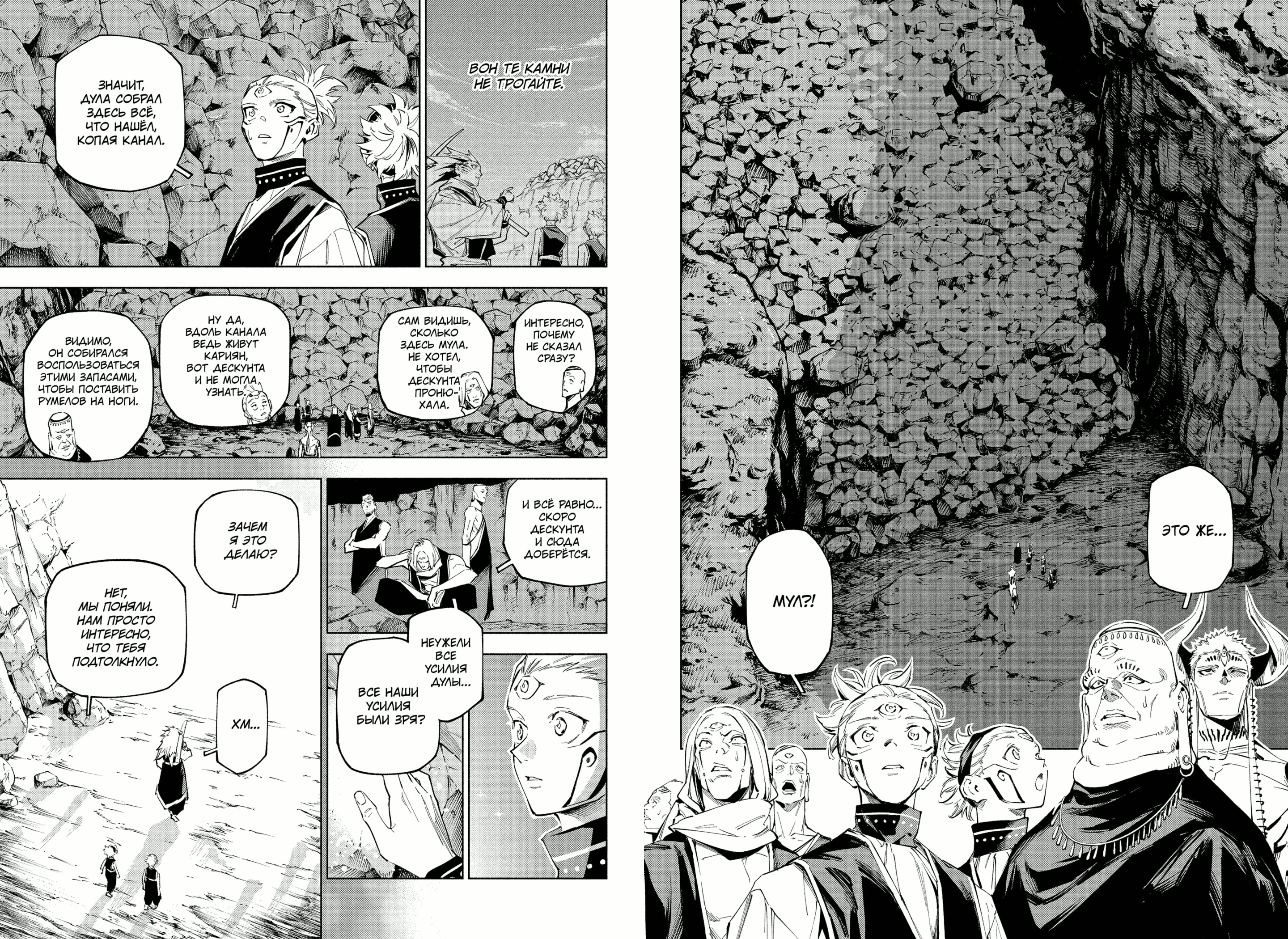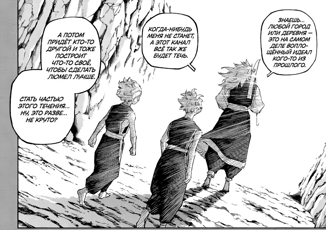 Главу перевели и там за гранью бреда. Короче. Пока срёмариане копали канал, надолбилась целая куча особого волшебного камня, который превращает Проклятую Энергию во все возможные другие виды энергии. На пикриле вы видите как Кросс и Мару взялись за руки, после чего их сила дружбомагии за секунду сотворила из этого особого камня - космический корабль. Да... просто так, без знаний и чертежей. Племенные бомжи из степей, ничего не знающие о космосе, технологиях, космических перелётах. Создали космический корабль силой дружбомагии. Геге хочет сказать, что он у нас теперь вместо Сортира... рисует сюрреалистичную Сатиру, в которой чтобы донести свою авторскую мысль, можно полностью положить болт на логику происходящего. Эдакий Андер Нинджа.
