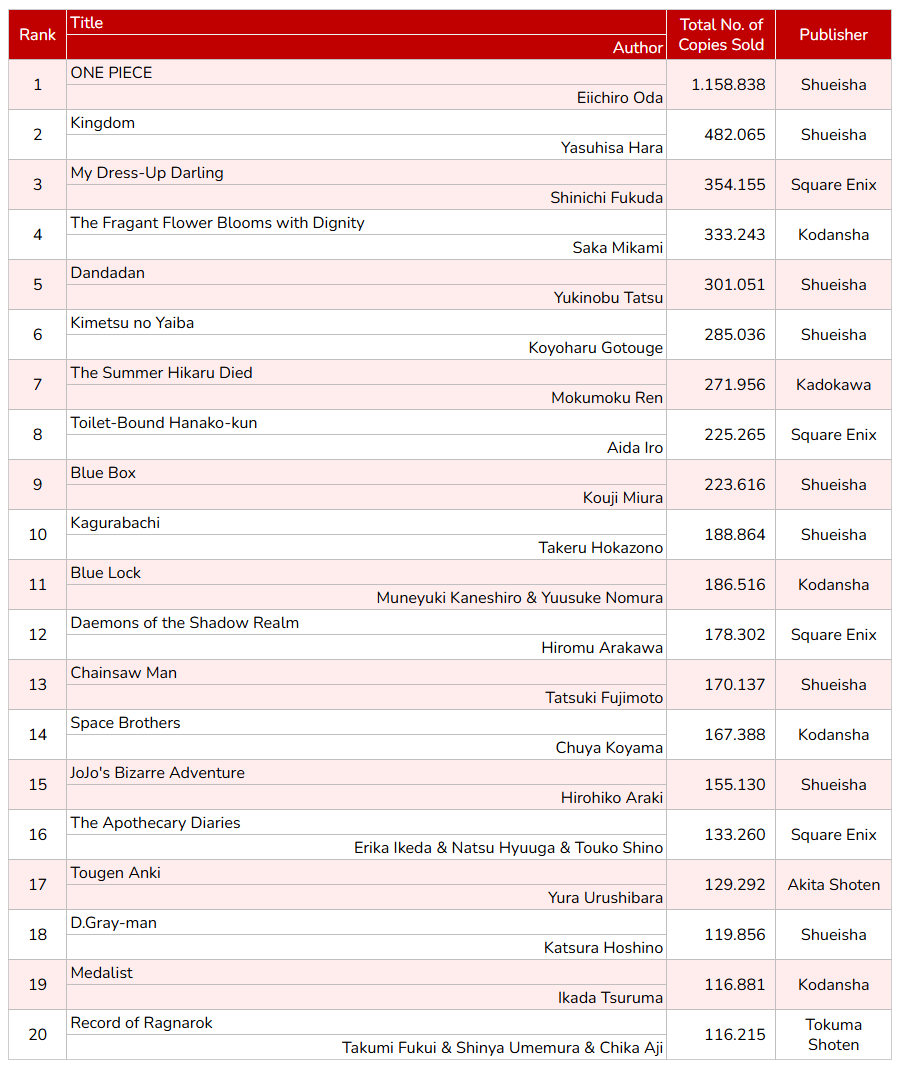 >>2457165 >Те самые единицы Весь топ-20 Oricon за июль наберёт гарантированно 1 млн. продаж если не за год, то за два. За весь 2024 год последняя манга в топ-50 Oricon (Blue Lock - Nagi) была продана тиражом более 500к. Это буквально десятки авторов.