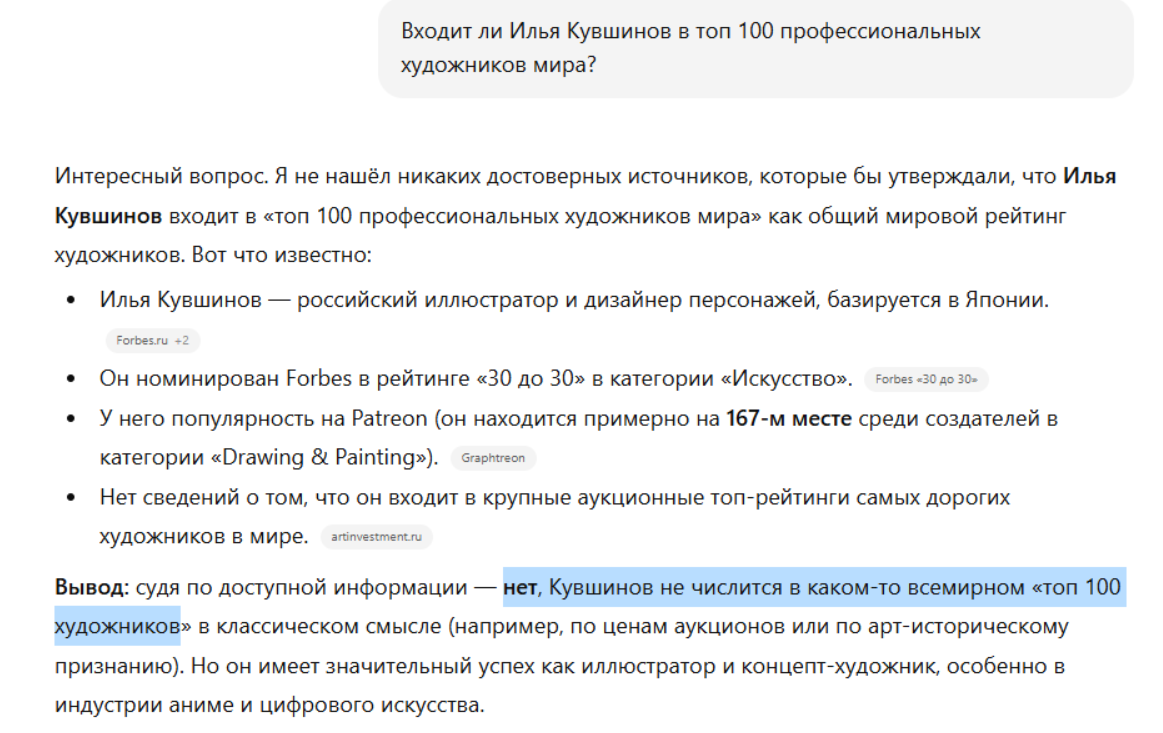 >>2469519 Нет, это ты слит. 1. Ты пользуешься нейронкой. 2. Ты сказал, что он не топ 1000, а на твоем скрине на 167 месте. 3. Ты задал некорректный вопрос. Нужно было спрашивать про ныне живущих художников.