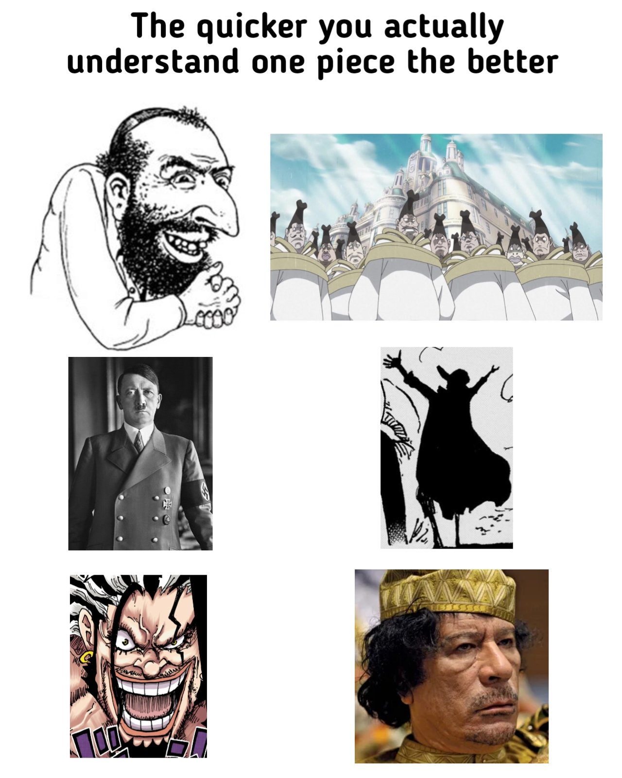 Вот для эльбаф арки тиран, который строит мир на силе и делит на господ и рабов исходя из этой же системы, был бы идеальным антагонистом. И тогда всё то, что ода впихнул во флешбек между роксом и гарольдом могло произойти между луффи и злодеем арки.