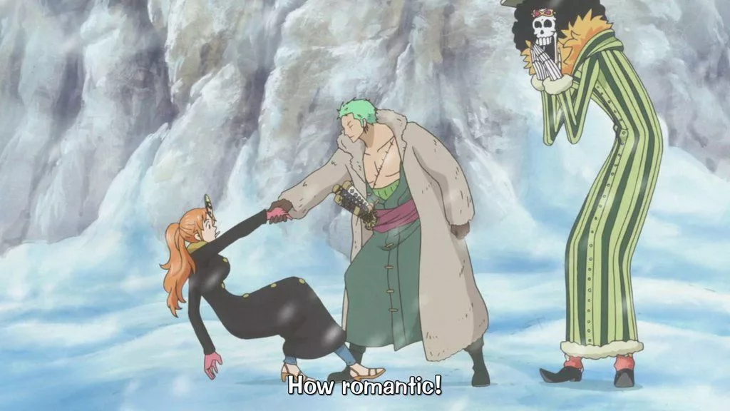 Я еще помню сцена на панк хазарде где Санджи в теле Нами, Зоро может еще Брук и Борода-пират какой-то бежали от лавины плохого вещества.