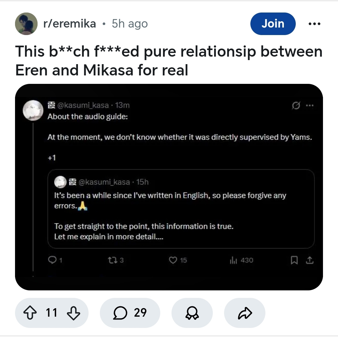 @monkey куда армин кончил микасе в ротик или в киску? смотрела ли птичка говныня с неба как армин-кун совокупился с микасой-тян? зачем калычу бензопила и против кого он будет её использовать? армин с микасой в каноне не трахались, это чисто фанфиковый бред ньюфага, так что кончил он в твои фантазии. птичка говныня с неба если и видела, то только как ты фапаешь на 2d. калыч бензопилой никого не пилил, это отсылка к какому-то шизотреду или chainsaw-man кроссоверу, в аниме манге такого нет, читай пасту переката а не порнуху малявьте.