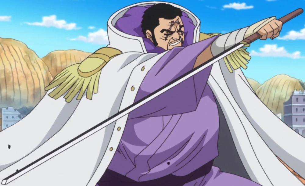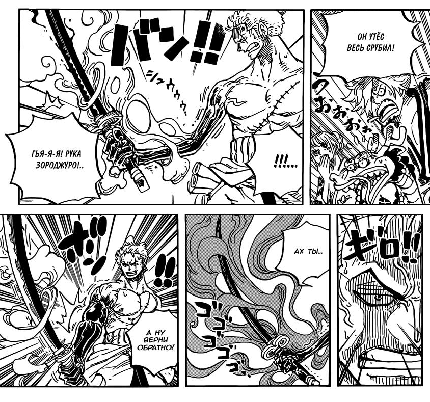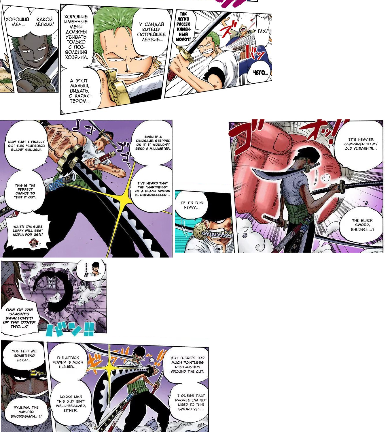 Клешится с Роксом. НО Он скрещивается не просто своей нагинатой, а рукой с абилкой фрукта (для разнообразия) против мечика Рокса. - это уже разнообразие. и луз за кадром