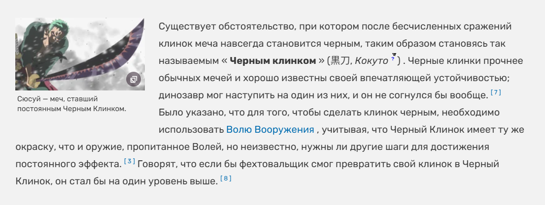 >>2460983 Уже нет. Нам в Вано рассказали, что чёрные клинки это особая фишка. Но не сказали, что это даёт. Зоро когда впервые взял клинок Рюмы, сказал, что он гораздо тяжелее и прочнее обычных клинков.