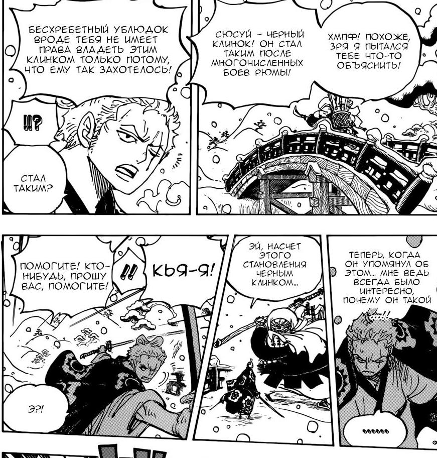 Еееебать... открываю вики по куску, а там написано, что эта параша с деревянной ручкой без гарды в руках Фуджиторы, один из Великих Клинков. Это откуда инфа? Новое SBS какое-то или датабук? Когда успели раскрыть? Ок... Ода нам хочет сказать, что Великим Клинком может стать и параша в руках великого пирата, если он в неё всю жизнь КВ заливал. Но, что тогда блять даёт почернение катаны? Почему у Михавка чёрный клинок, а Роджер, Белоус, Фуджитора, так и не смогли сделать свои клинки чёрными? Значит сётки важно кто ковал клинок? И чёрным может стать только правильно выкованный клинок? У Рюмы тоже чёрная катана.
