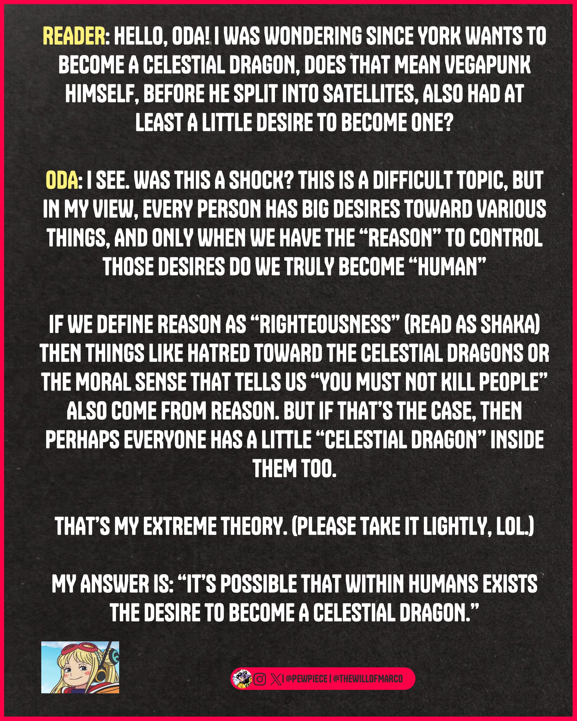 Ебать Ода мразь конечно. если он сука реально всё скатит в полнейшую избранность и даже не такую что Луффи похож характером на Роджера и получил его шляпу а вообще какие-то боги, воли, тысячелетние пророчества то пусть идет нахуй долбоеб пиздоглазый. Он буквально по пизде путит всю мангу и её посыл. Камина больше передает дух чем Луффи и вся манга после тс.