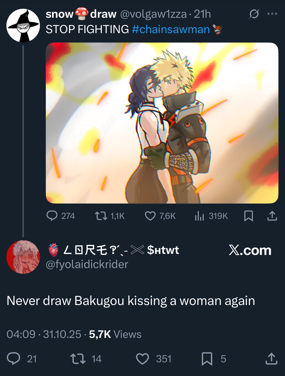В твиттере уже несколько дней сруться кто победит, Резе или белобрысый ил геройской академии. Кучу артов сделали, анимацию пилят, атак ещё и ревьюбомбят фильм по Резе, а тут 0 упоминаний, неужели всем похуй
