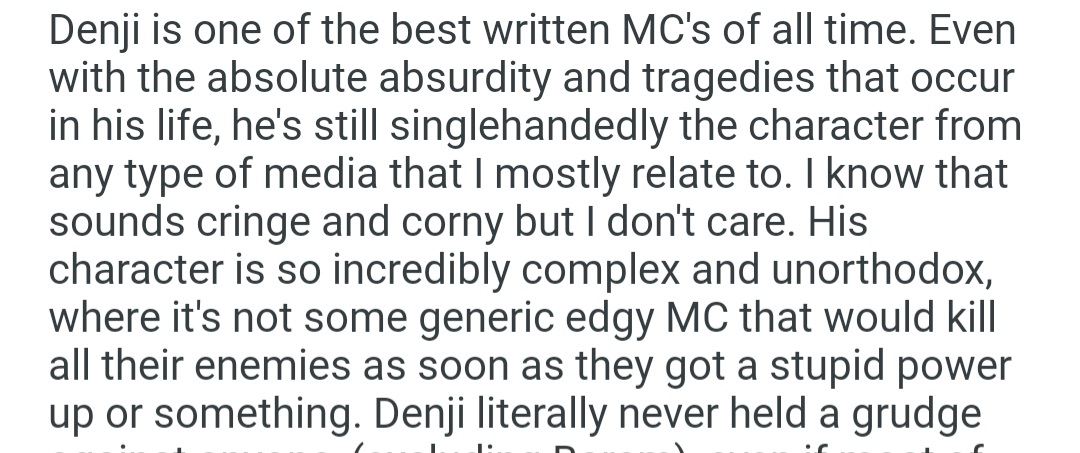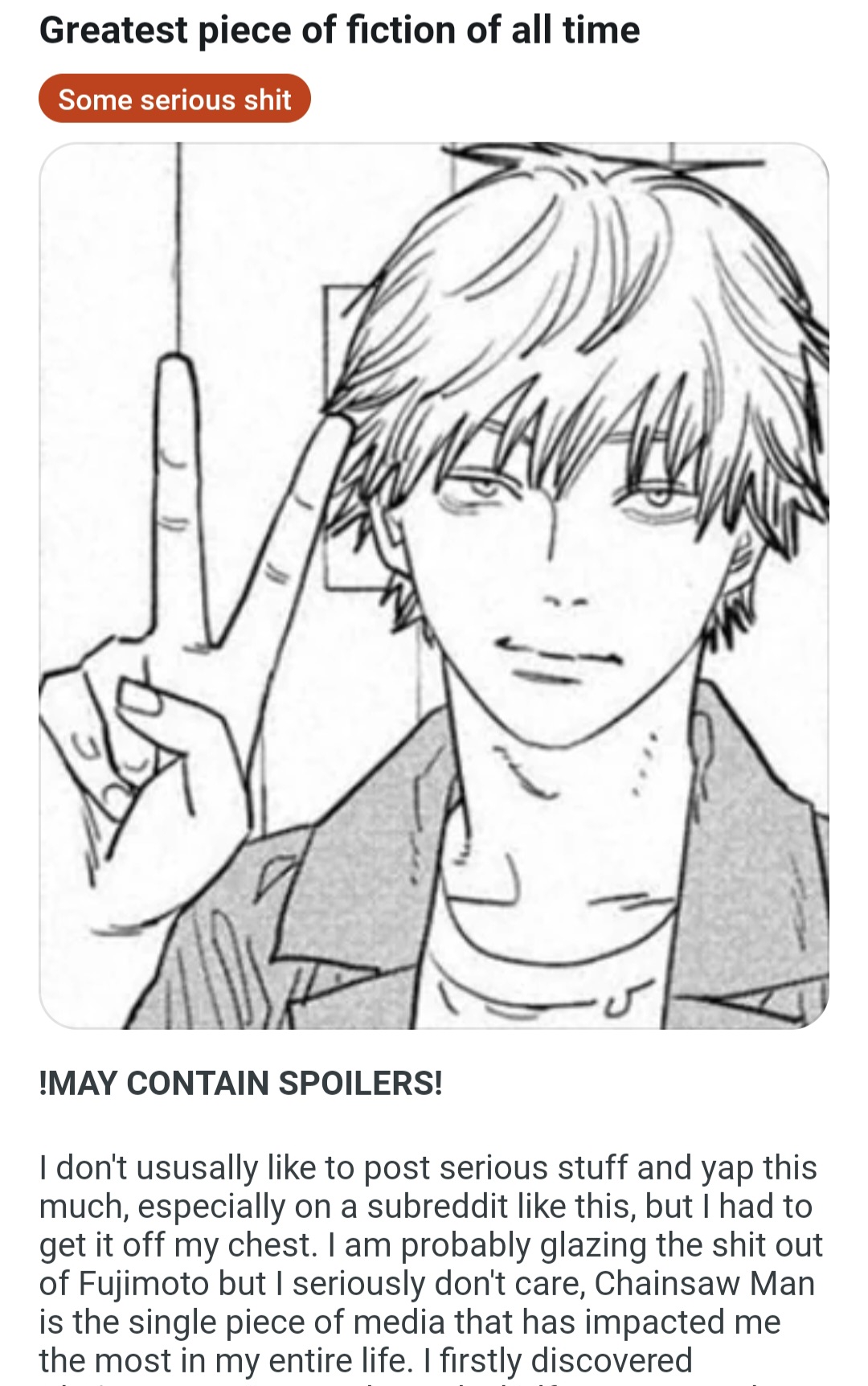 >>2462570 на этом дэнчиковские пиздострадания могли и закончиться почита ему судья а фудзимото зная свою инцельскую аудиторию такого не допустил бы конечно