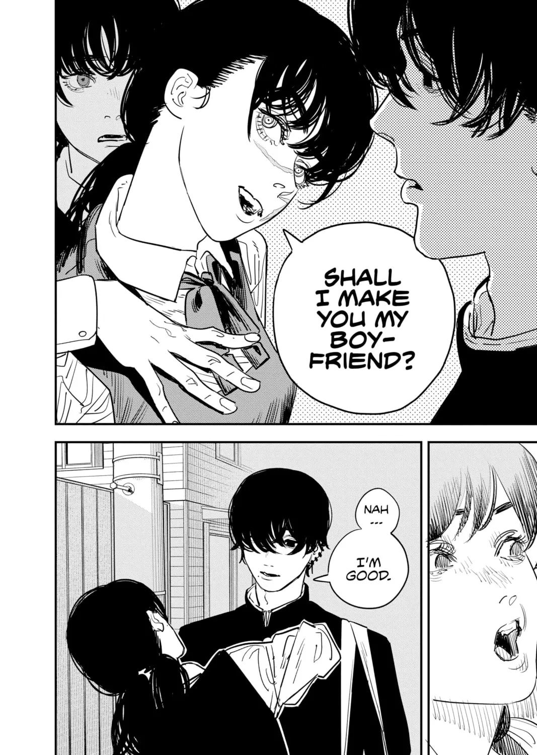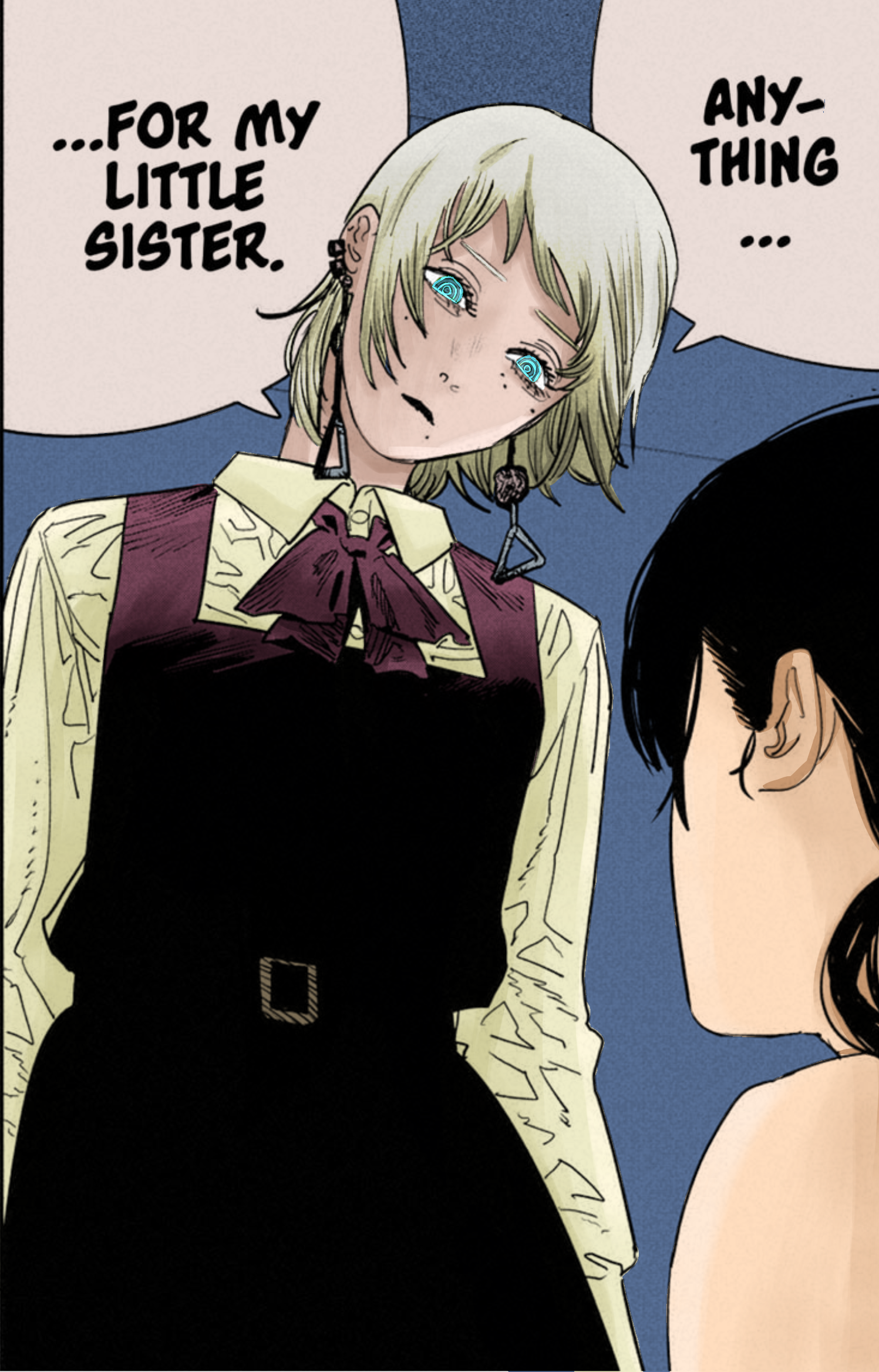 >Сестра, сестренка, ах какая милая лоли Да это вы ебанулись. Денису она никто, да еще и очередное перерождение Макимы, он ссался что она станет такой же. Не нужна ни Денису, ни автору, ни читателю.