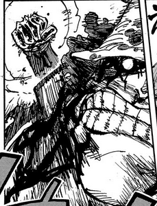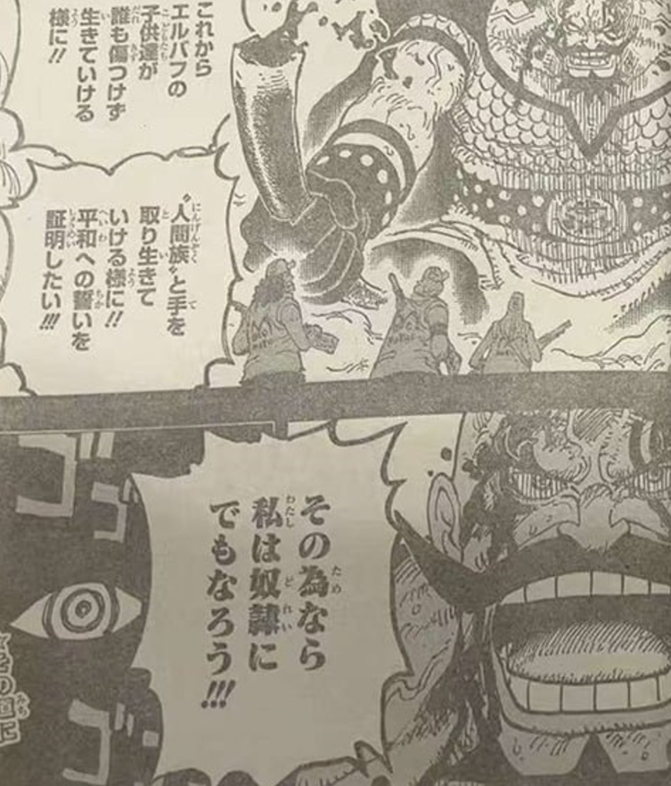 Затем, на эпичной последней разворотной странице главы, Гарольд вырвал свои рога!! После этого он встал на колени и протянул сломанные рога Морскому Дозору и Мировому Правительству, вся его лицо было залито кровью.