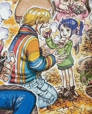 - Цветная обложка: -Ямато и Отама едят печёный батат с лисами и тануки после сбора опавших листьев-. Луффи, Зоро, Нами, Усопп, Санджи и Чоппер едят печёный батат в лесу с Ямато, Отамой и Синобу (и несколькими ниндзя-лисами и тануки).