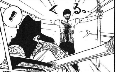 Вот прямо изображено все: Михоук собирается прирезать зоро, замахивается Зоро начинает исполнять финалочку Михоук охуевает, потеет и уходит в оборону тупо выставив перед собой меч плашмя Мечи Зоро ломаются потому что черный клинок пизже по грейду Зоро сдается