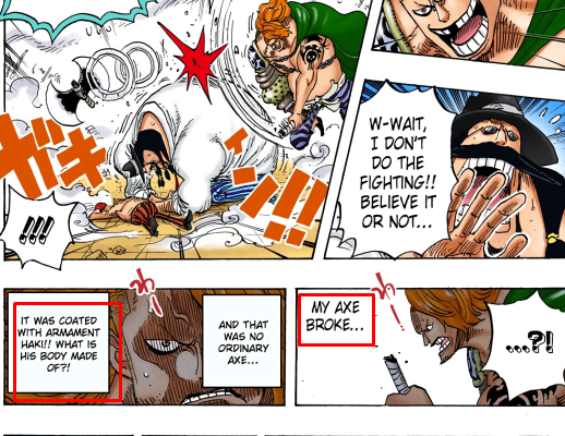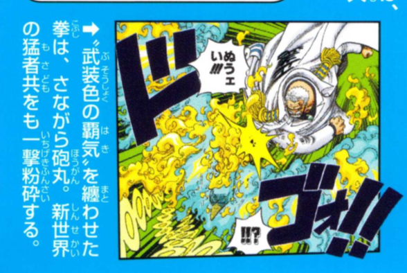 >То есть, тогда такого противодействия логии не было у воли? Ясненько. Пиздец Гарп тупой, тогда же хаки не было, а он хаки взял да и использовал, ну дурак. Странно, что помимо удара Гарпа с хаки все остальное не нанесло урона ему в форме, но противодействия фруктам тогда не было, так хантеродаун сказал "武装色の覇気”を纏わせた拳は、さながら砲丸。 新世界の猛者共をも一撃粉砕する。 The fist imbued with armament haki is like a cannonball, capable of pulverizing even the fierce warriors of the New World with a single blow.