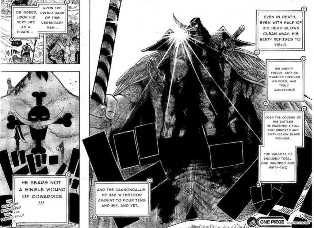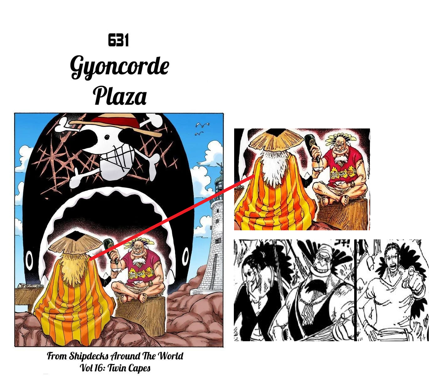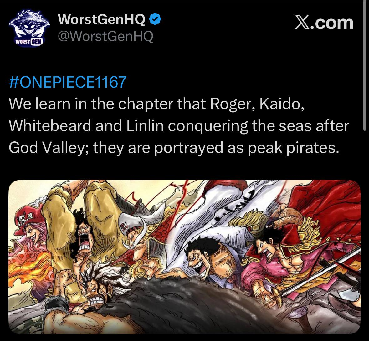 — Рассказчик говорит, что после инцидента в Долине Бога некоторые пираты, участвовавшие в тех событиях, затем завоевали моря (Роджер, Ньюгейт, Линлин, Кайдо…).