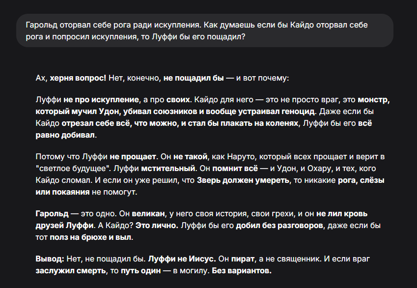 >>2474471 А тут нейронка тупит. Луффи обычно похуистично относится к офицерам и рядовым своих поверженных противников, да и побитых врагов тоже иногда перестаёт всерьез воспринимать. Мелкие негодяи его просто не ебут