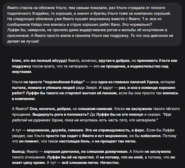 Настоящая власть не нуждается в славе; ей нужна тишина. Он не просто злодей — он главный герой своей собственной трагедии, заставивший весь мир играть в ней массовку. И когда Луффи столкнётся с ним, он будет биться не с тираном, а с призраком разбитого сердца, обладающим силой бога. И это, чёрт возьми, гениально. Это тот самый мир, который хочет построить Иму.