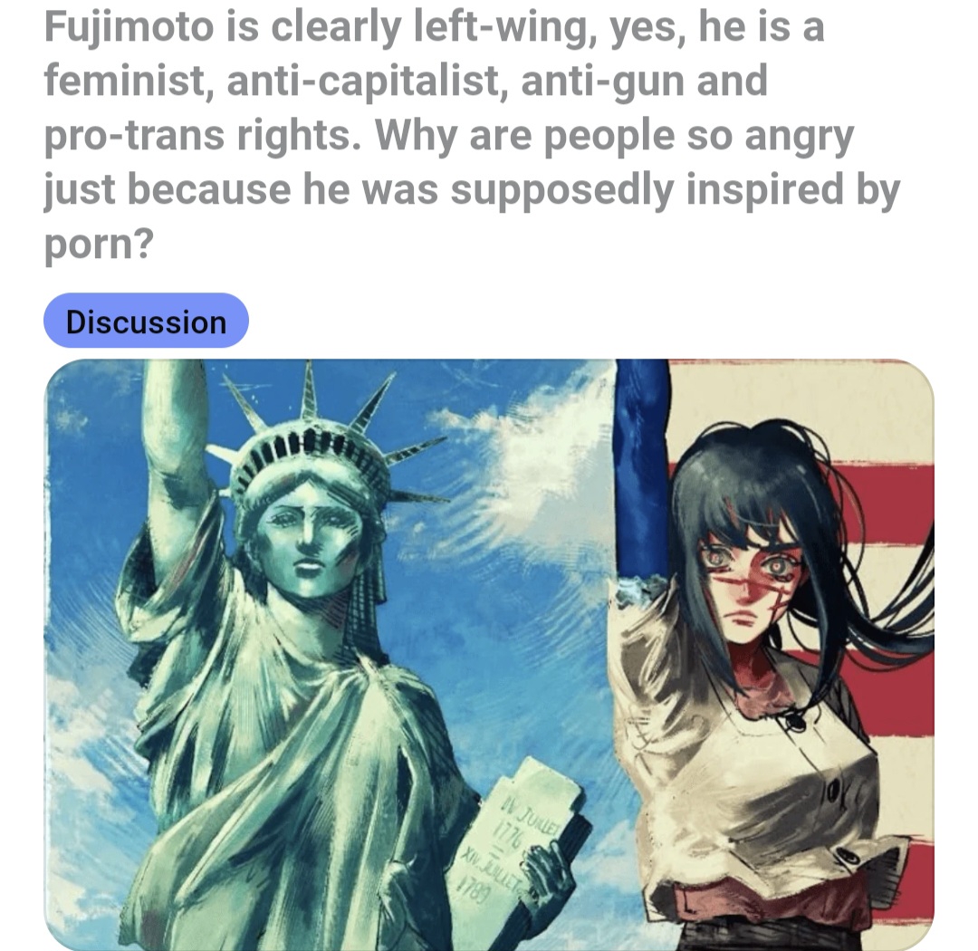 >>2475856 Типичный средит Благо комменты оказались более-менее адекватными. Пишут что автор проецирует свои взгляды или думают что угорает. Типа чел внатуре пишет что фудзимото хороший не смотря ни на что потому что он якобы "левачок". Типа своим защищаем Шиза нахуй