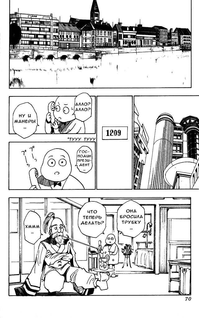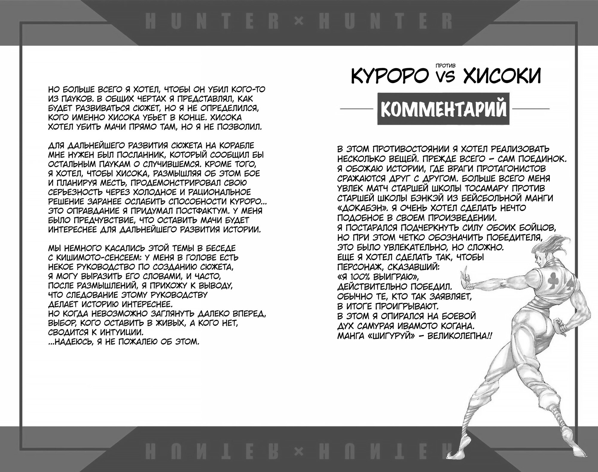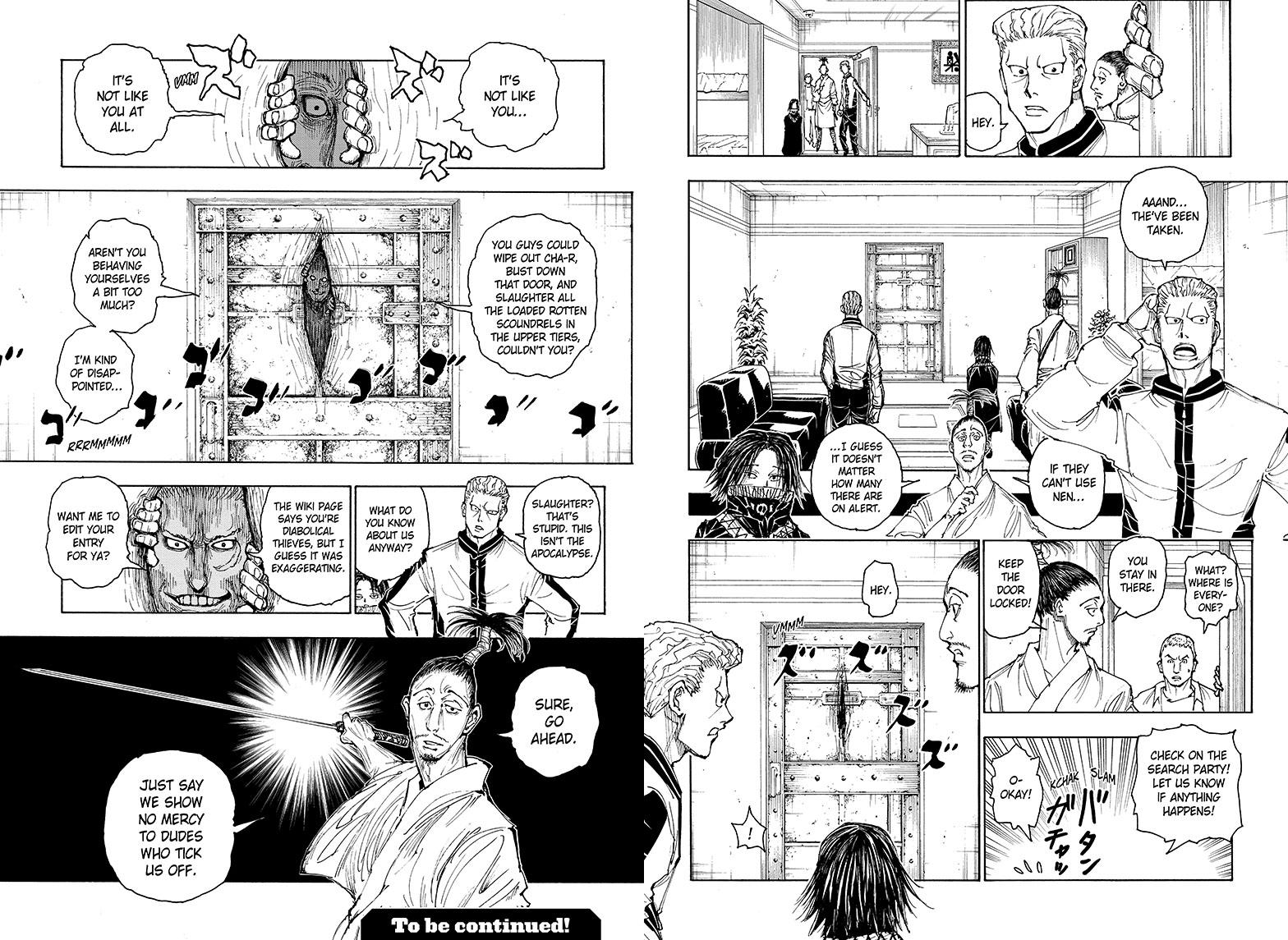 борщанул конечно он с уровнем серьезности в арке. Двух главных героев пиздюков выкинул из истории, построил всю арку вокруг взрослых и их борьбы за престол. Из главных лиц мрачный молчаливый Курапика, мрачный молчаливый Куроро, мрачная Морена с гиперболизированной местью всему миру, мрачный Церендич и только Хисока веселый своей хаотичностью чел, но его практически нет. Конечно помимо него еще есть рофло персы как охранник симпящий по Бискит и чел, что хочет автограф от пауков, но с ними суммарно страниц 5 наберется. И еще мало того, что имеющиеся главные лица одинаковые так к тому же все их мысли это анализ ситуации на корабле. Не хватает чего-то простого в мыслях и переживаний как было у Киллуа и Гона. Мне кажется за счет этого финал арки слабым ощущаться будет в отличии от муравьев, где Тогаши на эмоциях хорошо сыграл