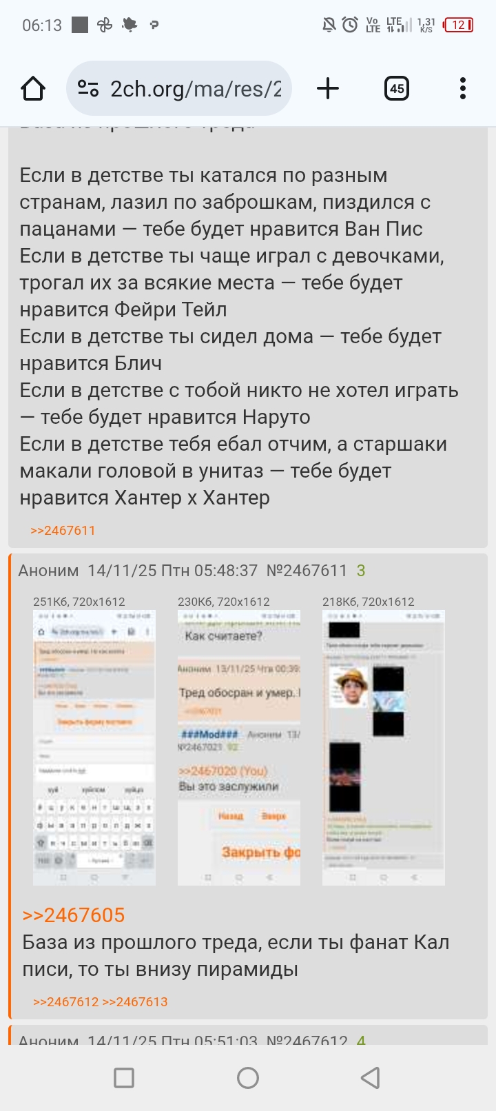 Если в детстве ты катался по разным странам, лазил по заброшкам, пиздился с пацанами — тебе будет нравится Ван Пис Если в детстве ты чаще играл с девочками, трогал их за всякие места — тебе будет нравится Фейри Тейл Если в детстве ты сидел дома — тебе будет нравится Блич Если в детстве с тобой никто не хотел играть — тебе будет нравится Наруто Если в детстве тебя ебал отчим, а старшаки макали головой в унитаз — тебе будет нравится Хантер х Хантер