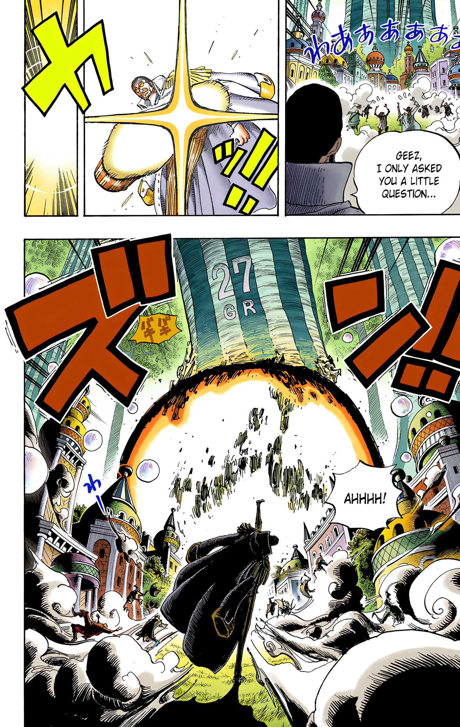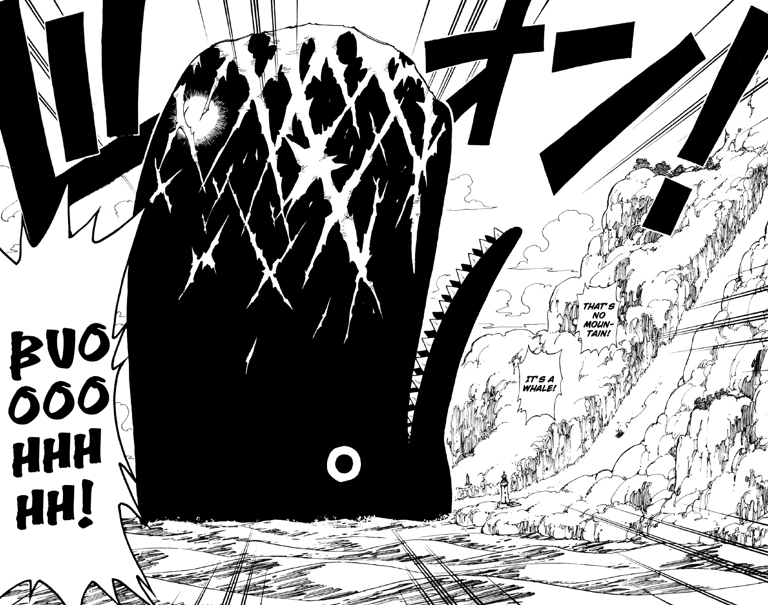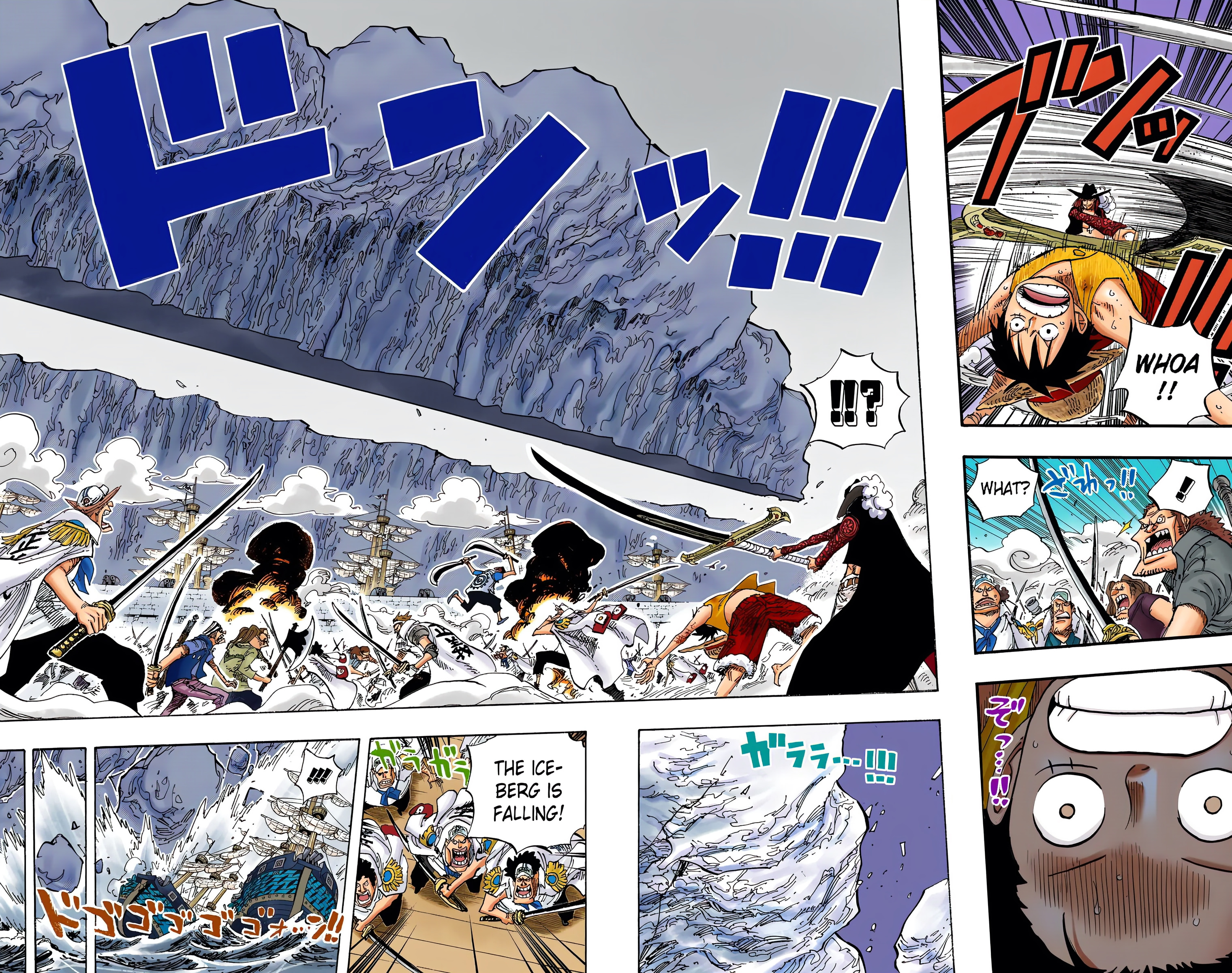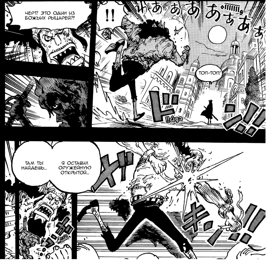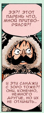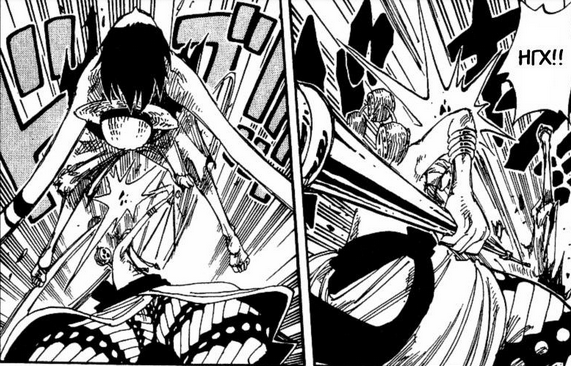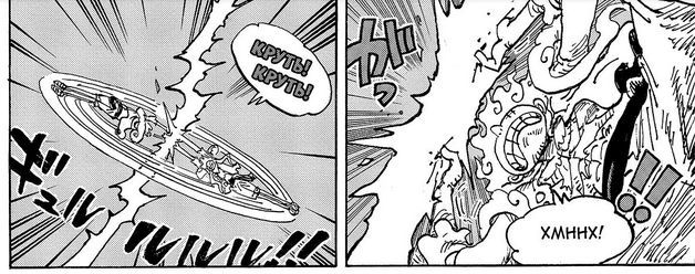 Что в этот момент делает Тайгер? Он атаковал левой рукой, но от атаки уклонились и нанесли ответный удар? Или он замахнулся для удара правой, но получил удар в этот момент? И вообще, что это за веревка (или лента) у него в левой руке? Судя по линиям движения у левой руки, он атаковал Шанкса левой. Если присмотреться, кажется, что с головы Шанкса летят брызги крови, так что, видимо, он левой рукой сорвал с (лица) Шанкса повязку/бинты. Зачем? Лол. Почему он решил первым делом сорвать бинты с лица противника, который несется на него? Это не выглядит так, будто они оторвались случайно при ударе. Он держит их в руке, значит, он намеренно пытался их сорвать, так ведь? Почему? Если это было ради того, чтобы увидеть лицо и узнать личность, раз уж оно скрыто бинтами, то стоило добавить фразу вроде «Кто ты?». И вообще, если уж вставлять сцену с сорыванием бинтов, нужно было нормально нарисовать лицо противника (в бинтах) до этого. При такой рисовке нет никакой информации о «бинтах», Поэтому читатель ни за что не поймет, что именно Тайгер сжимает в левой руке на этом кадре. Почему же он постоянно рисует так непонятно... В общем, подводя итог: смысл, видимо, в том, что «Тайгер левой рукой срывает бинты с лица Шанкса, и в тот же момент Шанкс, разрушая ошейник Тайгера, проскальзывает мимо него с левой стороны». Но такое движение физически невозможно. Левая рука Тайгера полностью вытянута, он атакует ею лицо Шанкса. Как в такой ситуации можно, сближаясь, разбить ошейник (который находится на шее Тайгера) и при этом проскочить влево от него? Это же нереально. Если уж уходить, то под правую руку Тайгера. Из-за такой рисовки крайне сложно понять, что происходит, а даже если понять — это выглядит невозможным, поэтому сцена воспринимается максимально неприятно и коряво.