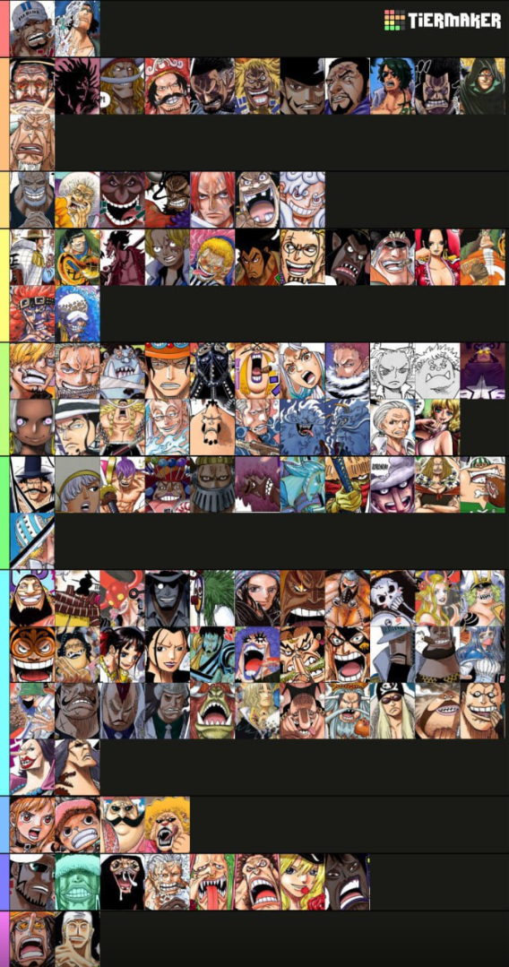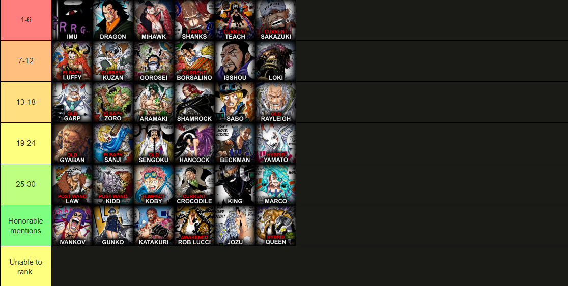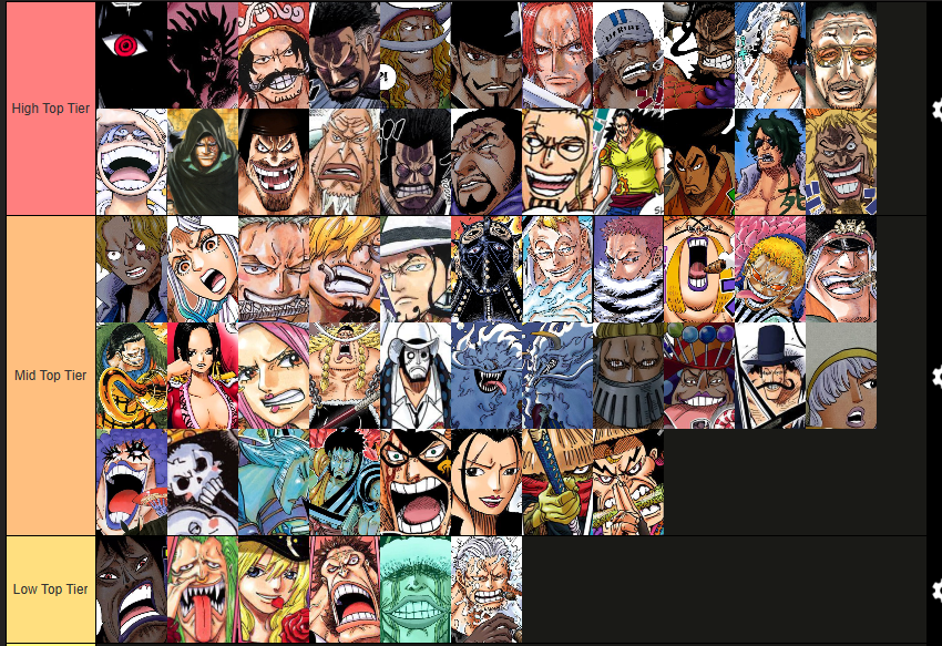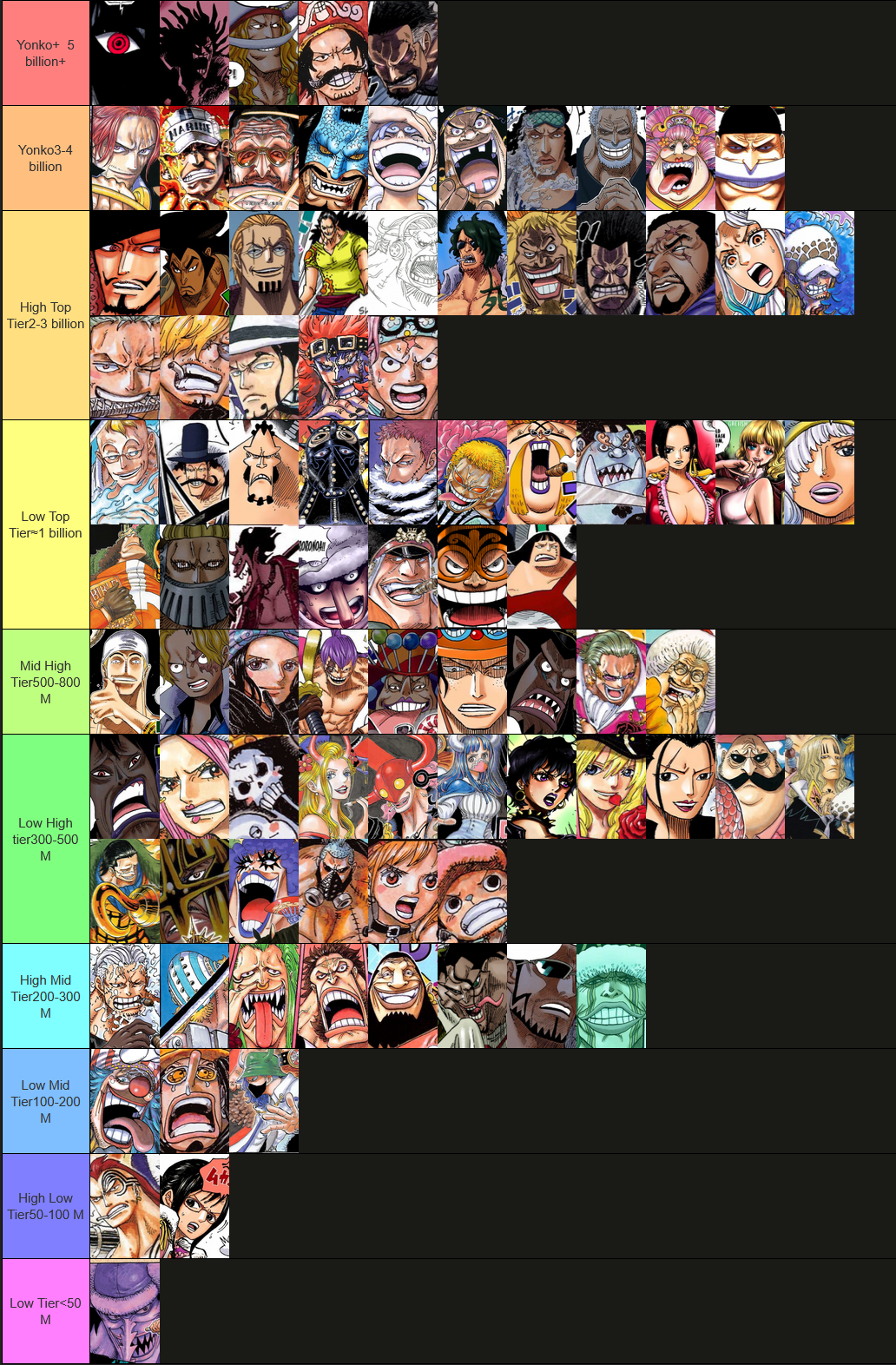 Вот. Топ состоит исключительно из фактов. Рядом с тиром добавил ориентировочную награду, если бы она зависела исключительно от силы самого персонажа (как Ода делает для многих, но далеко не всех персонажей).