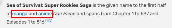 >>2480176 >Sea of Survival: Super Rookies Saga is the given name to the first half of manga and anime One Piece and spans from Chapter 1 to 597 and Episodes 1 to 516.[1][2] >It is separated into six sagas, each saga being divided into arcs. The plot follows a pirate, Monkey D. Luffy and his quest to form a pirate crew and sail to the Grand Line to find the fabled One Piece, which will make him the "Pirate King". It is immediately followed by The Final Sea: The New World Saga. 6 саг? Кто-то пиздит, здесь две то а уже Ода хочет закончить.
