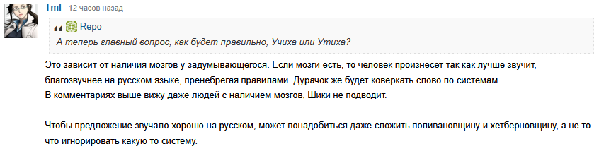 >>2481386 >Если мы рассматриваем например Утиха и Учиха, то можно сказать, что Учиха более худший вариант >ну просто потому что шипящие принято >принято Кем принято? Почему принято? Когда принято? Это не такая же тема как с буквой Ё? 200 лет назад у кого-то типография была дорогая печатать лишние две точки, давайте удалим. Люди слышат как профессиональный японский сейю, носитель языка, владеющий великолепным японским говорит довольно отчётливо Учиха, а потом прибегает чувак, строит соломенные чучела: вы читали неправильных переводчиков, вы читали с английского, хотя банально все так слышали со времён фандаба от самих японцев, почему этот вскукарек не ругается на японских актёров озвучания? Конечно, у многих диссонанс, какая ещё Утиха? Мама утка или что это? С какой стороны тут утята ещё? А издатели могли спокойно пойти на встречу читателям, и оставить привычное для слуха Учиха, но походу яйц нема, может у них комплексы какие. Книжные переводчики почему-то могли раньше Дриззта в Дзирта переделать, и никто не против был, все всё понимали.