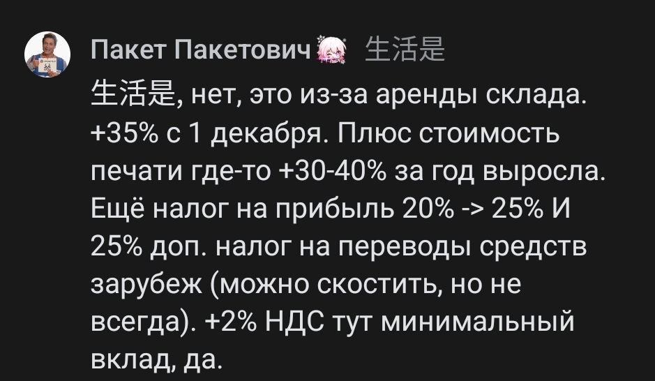 >>2483609 Оптимистичный прогноз. Я думаю, парочка издателей до конца года не доживут. Людям как-то всё меньше дела до роскоши, которой является печатная манга, а та им навстречу дорожает. Но посмотрим.