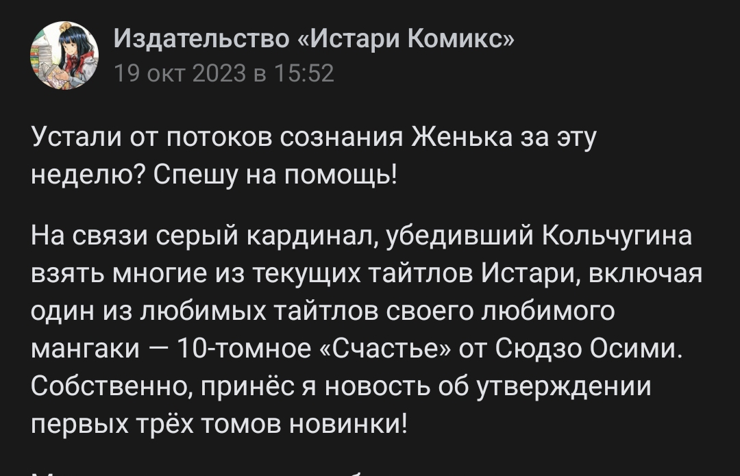 >>2480947 >Тем более нынешнее руководство азбуки видимо не заинтересовано в манге Это не так, я кидал интервью редактора сюда, он говорил что японцы стали отвечать по полгода и договор о какой-то лицухе может годами длиться